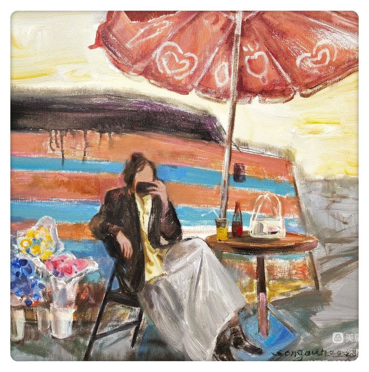 陽光把陽傘,在地面上畫了一個(gè)大大的花朵,與對面的火焰花遙相呼應(yīng)。