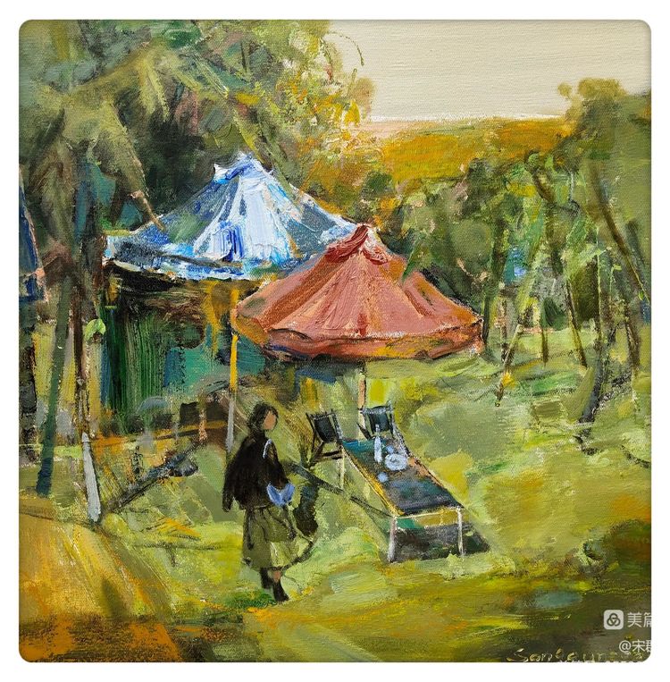 坐在小院子的陽傘下面,喝茶、聊天、看云、觀景,是每天最愜意的時(shí)光了。鳥兒在林中鳴唱,聲音悅耳,像一串串響亮的舞著節(jié)奏的音符。
