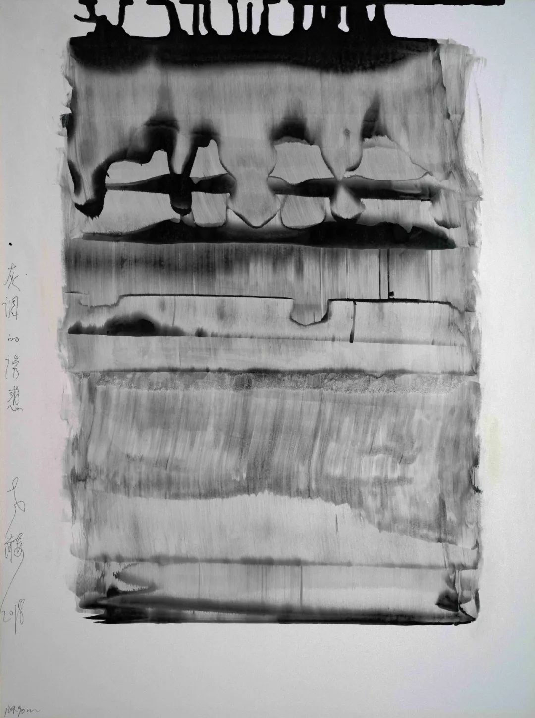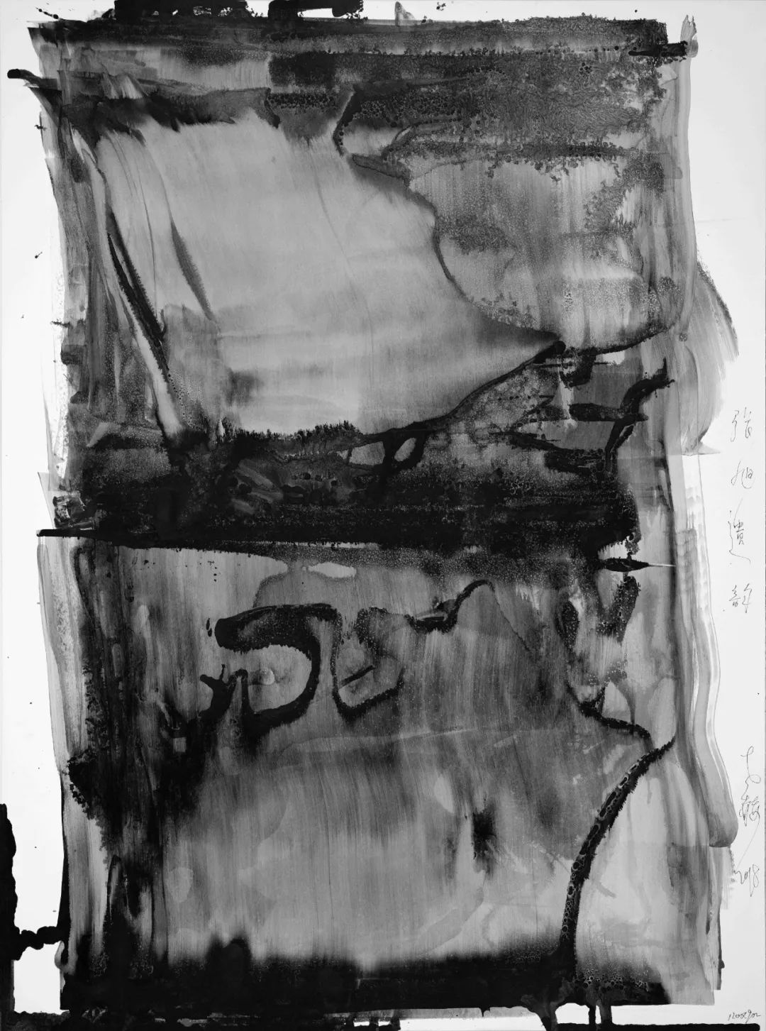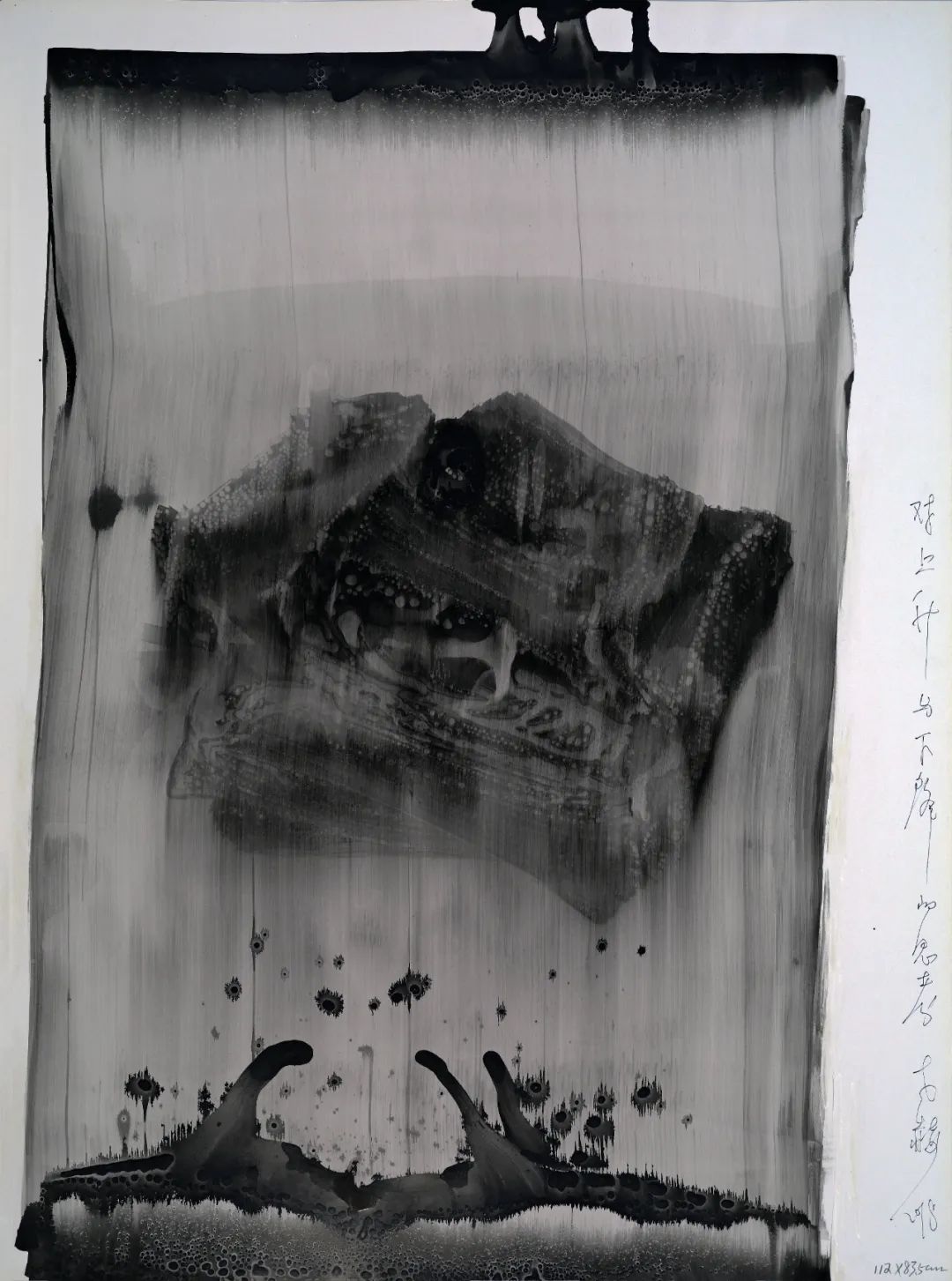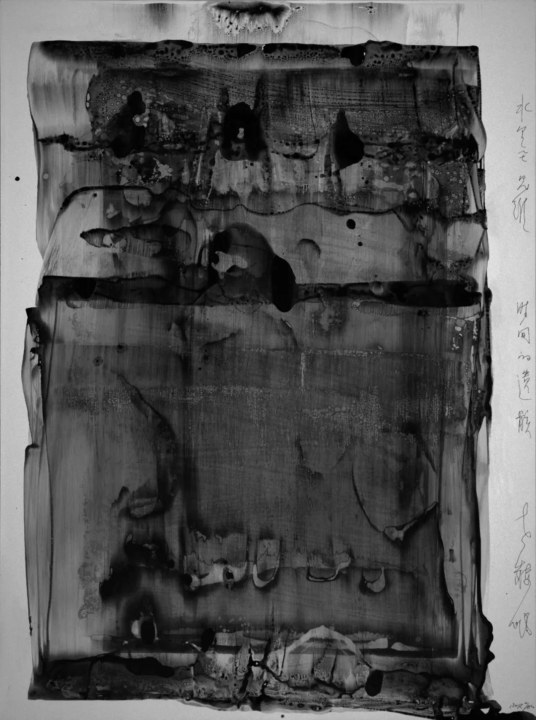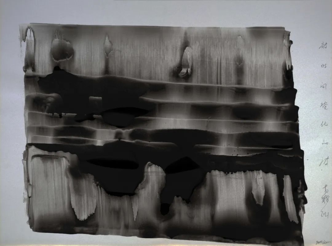 我用“筆”用“墨”形成的特殊肌理好似經(jīng)過(guò)時(shí)間、經(jīng)過(guò)風(fēng)雨,而留下的歷史 DNA,它們是時(shí)間的遺骸和生命的化石,它們被嚴(yán)酷的自然環(huán)境抽打、擠壓、碰撞、蹂躪。它們隱忍,但并非是僵死的,它們默默地和時(shí)間做經(jīng)久不息的對(duì)壘和死磕,那些斑痕、那些特殊肌理是它們面對(duì)獨(dú)特觀(guān)眾的言說(shuō)與炫耀。那些特殊的肌理和結(jié)構(gòu)展現(xiàn)了不一樣的生命與時(shí)間,是對(duì)生命節(jié)點(diǎn)的呈現(xiàn)和剖視。人是宇宙的細(xì)胞,宇宙因?yàn)槿说拇嬖诓奴@得了它存在的意義,我用一種特殊的方式和時(shí)間對(duì)話(huà),用一種特殊的方式與生命聊天。