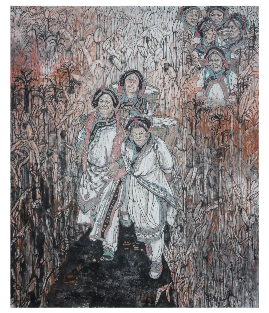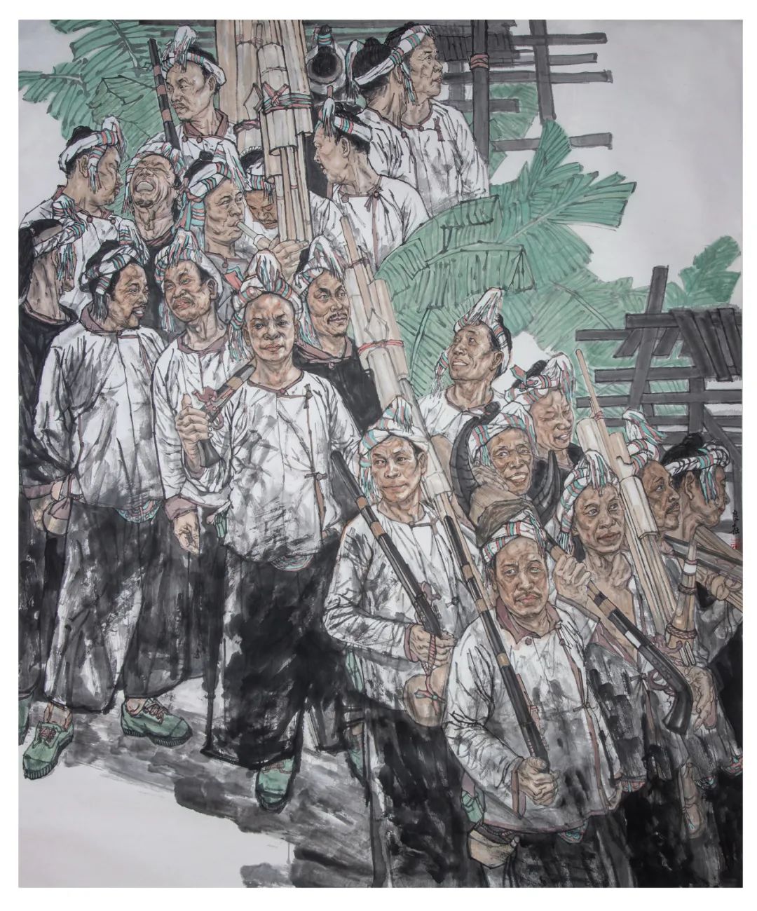 得知良在老師入圍國展的喜訊,我迫不及待的讓他把作品照發(fā)給我欣賞。我早年學(xué)過國畫,雖未登堂入室,但略懂一二,也十分關(guān)注全國美展動向。眾所周知,全國美展本就是美術(shù)界最重要的文化品牌,是全國繪畫精英爭奇斗艷的舞臺,代表著當(dāng)代美術(shù)的水平和風(fēng)向。但2019年的全國第十三屆美展,傳統(tǒng)寫意畫寥若星辰,中國畫明顯走向工筆化、素描化,雖然依然講究構(gòu)圖用色,但用筆已經(jīng)基本拋棄了傳統(tǒng)中國畫的經(jīng)典技藝。我想,精英思想以求新為要,在精英思潮的沖擊下,傳統(tǒng)文化和技藝往往遍體鱗傷。從我內(nèi)心出發(fā),更希望國畫精英能深耕傳統(tǒng)經(jīng)典,在作品的“文氣”和“雅趣”上求新求變,而不是簡單的在技法和繪畫形式的求變。所以我更希望全國美展回歸傳統(tǒng)經(jīng)典,有更多精彩寫意?;诖耍曳浅Y澷p良在老師的堅(jiān)守傳統(tǒng)寫意,既欣賞他根植傳統(tǒng)追求線條的質(zhì)量和筆墨的趣味,也欣賞他從底層人群中選材表現(xiàn)時(shí)代風(fēng)尚的手法,我想中國畫發(fā)展的方向不久將回歸傳統(tǒng),傳統(tǒng)寫意中國畫的春天會再次來臨。也相信蔡良在老師迎來“井噴爆發(fā)期”后,會繼續(xù)上下求索,未來定會“遍地花開如錦繡”,走向更高更新的藝術(shù)殿堂。