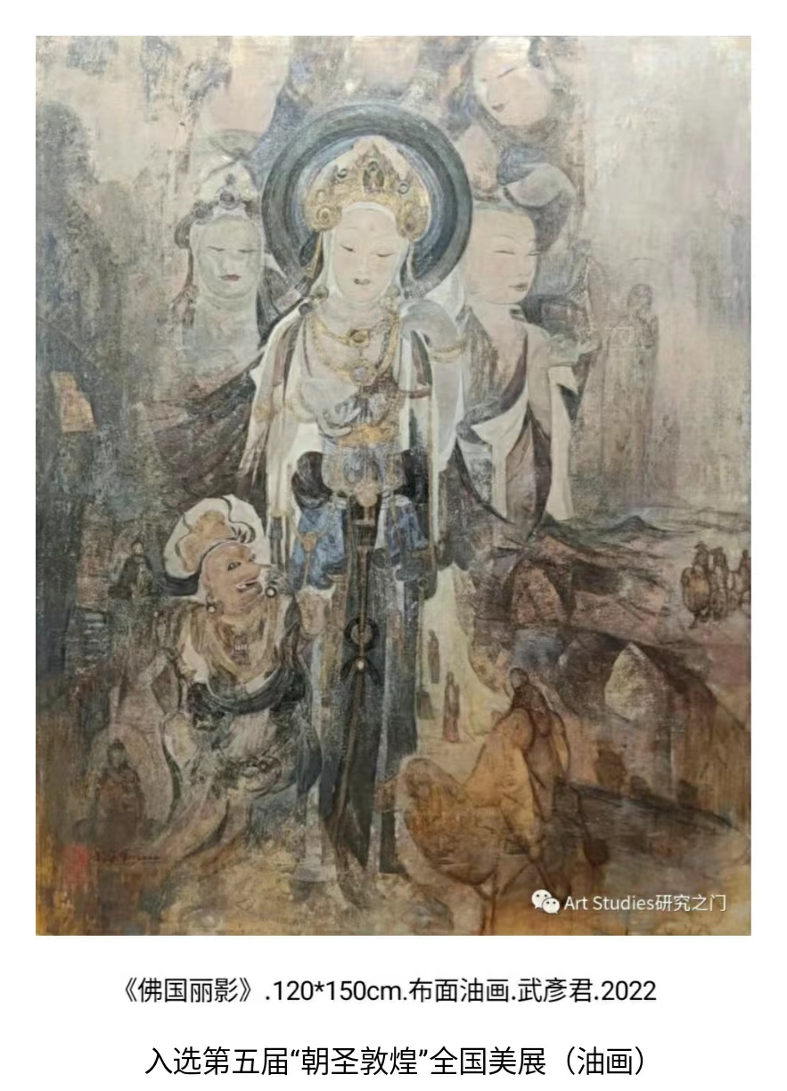 選擇這蹲菩薩作為畫面創(chuàng)作表現(xiàn)的主題,不僅因為它美麗的形象,透過前衛(wèi)的榮華服飾、豐韻的體態(tài)和東方大國君臨天下般的端莊氣質(zhì),可以感受到唐風遺韻和盛世繁榮。最讓人震撼心靈的還是昔日敦煌那不堪回首、充滿歷史掠奪和風雨滄痕的殘墻斷壁,在悠悠歲月里散發(fā)出來的愈發(fā)驚艷的藝術(shù)魅力……我著迷于這種裂痕和墻壁被風化的泥土味道,通過碎片式的組合、多維度的空間構(gòu)圖和類似材料般的肌理表現(xiàn),表達了對神秘敦煌的真實感受,是愛?是恨?是喜?是憂?……不好說出,也終究說不出來…。