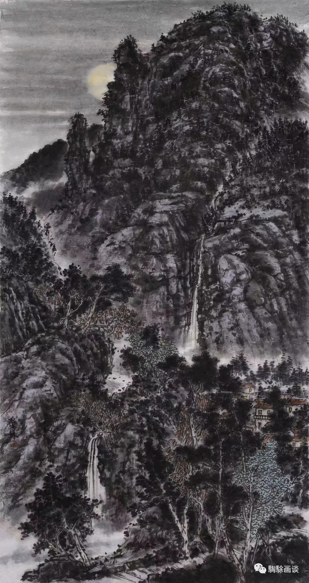 近年來,吳華林亦開始關(guān)注山水畫的主題創(chuàng)作,并嘗試將山水與花鳥題材進行立意布局,以拓展彼此的風(fēng)格及內(nèi)容表達。他在游歷與學(xué)習(xí)的過程中,尤其關(guān)注北派山水的現(xiàn)代轉(zhuǎn)型問題,如對“巨碑式”山水風(fēng)格的研習(xí),以范寬、李唐、郭熙等古人的立意布局及皴染技法為范本,細致摹寫品讀。與此同時,他對現(xiàn)代山水畫家李可染、黎雄才、賈又福等人的藝術(shù)風(fēng)格亦有充分的借鑒。他的山水畫重視對北方山川的藝術(shù)描寫,追求其雄奇、悠遠的視覺感受。《月是故鄉(xiāng)明》展現(xiàn)了崇山峻嶺之中的山村夜景,霧氣彌漫著初升的圓月,在峰巒的掩映中散發(fā)出醉人的光韻,觀者的目光沿著飛騰的瀑布向下方游走,跌宕間所形成的水汽繚繞,掩映著幽靜的村落。透過重重枝影,簡約的屋頂及隱現(xiàn)的燈光讓人感受到現(xiàn)代鄉(xiāng)村的生態(tài)宜居。視點繼續(xù)沿著瀑布向下方移動,高大的枝干、空曠的潭水及蜿蜒的小徑回環(huán)向上,與瀑布的運動形成逆向?qū)Ρ?,山水交錯為我們營造了月影朦朧中的詩情與畫意。從畫面的具體塑造上來看,畫家的筆墨點染蒼勁渾厚,云氣、月光、山石與樹木的刻畫為此情此景作出了極佳的鋪陳。