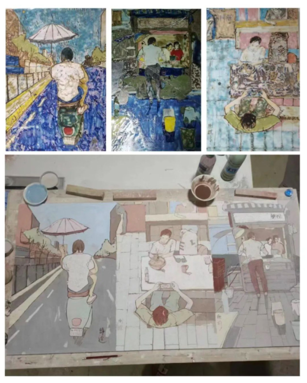 直到如今告別景德鎮(zhèn)回到學(xué)校,看著當(dāng)時(shí)創(chuàng)作的瓷板畫,處處都是驚喜,高溫顏色釉的豐富多彩和流動(dòng)性大的特點(diǎn),讓作品有滿意的畫作,也有失敗的案例,但是要準(zhǔn)確把控高溫顏色釉,還是需要多接觸、多學(xué)習(xí)、多實(shí)踐。