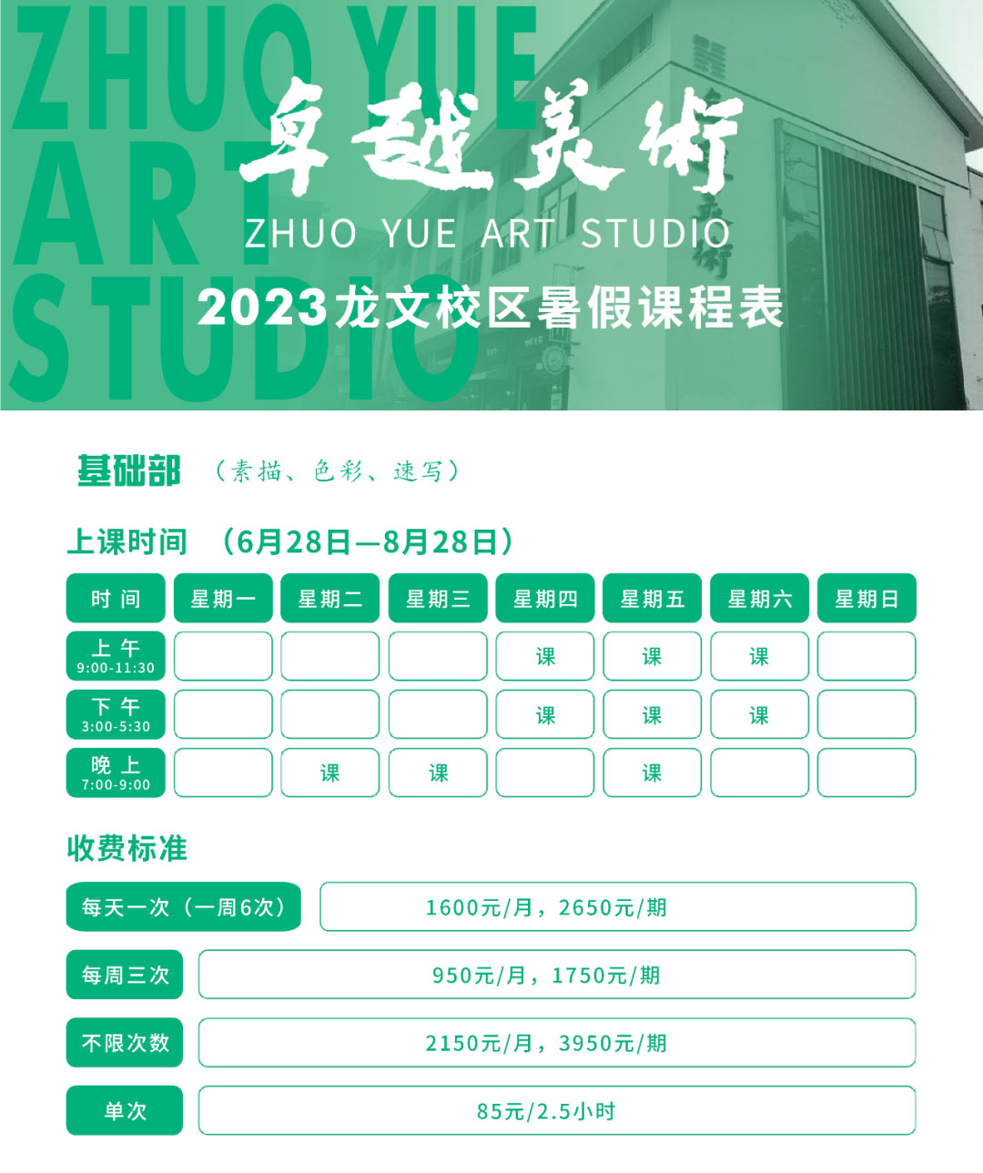 總部(八卦樓校區(qū))和龍文校區(qū)(榮昌花園)分別有基礎(chǔ)部和少兒部,八卦樓校區(qū)位于省級(jí)文化產(chǎn)業(yè)示范基地---八卦樓文化城,教學(xué)面積800多平米,龍文校區(qū)位于榮昌花園晨暉大廈,商業(yè)地段,教學(xué)面積近千平米,分層次,分學(xué)科,因材施教,系統(tǒng)規(guī)范。卓越畫室還擁有龍巖校區(qū)、金峰校區(qū)、長(zhǎng)泰校區(qū)等,方便學(xué)生就近學(xué)習(xí),為當(dāng)?shù)靥峁﹥?yōu)質(zhì)學(xué)習(xí)平臺(tái)。