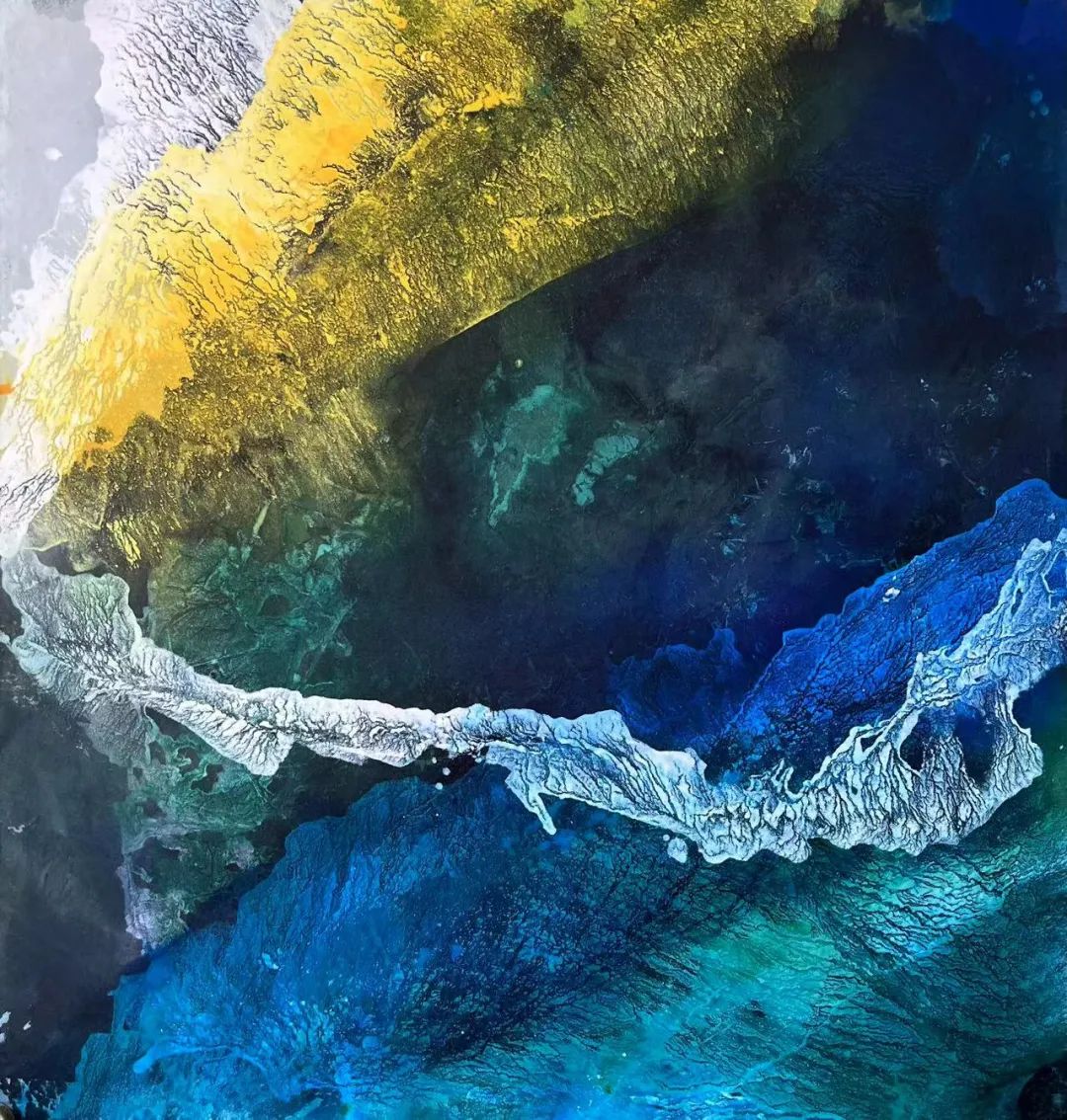 以肌理作為繪畫的支配元素,某種角度顛覆了傳統(tǒng)中國畫的觀念。沒有物體的實在,也沒有形象的堅固性,畫面只是某種聯(lián)系、交互和意義的解析,卻強化了內(nèi)在體積感,渾穆通透,邃遠(yuǎn)絢爛和充滿動勢,蘊含無限的生氣和力量,而不是僵枯、呆喑的了無生趣。由肌理連結(jié)的不同形象,以生動的繪畫語言和極富表現(xiàn)力的鮮明形式,展示了一個個充滿想象的復(fù)合空間。因而他的作品更像一種情緒的宣泄、一種氣氛的烘托,一種詭譎奇異的幻象,滿含對于現(xiàn)實的神秘感覺又有力地把握著現(xiàn)實。