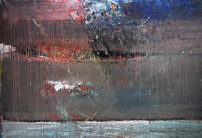 他堅(jiān)守自己所篤信的創(chuàng)作理念,沒(méi)有刻意去挖掘作品附和社會(huì)現(xiàn)狀的主題意識(shí),而是自然而然地通過(guò)形態(tài)、色彩、筆觸的調(diào)動(dòng)傾注他的激情和向往。這過(guò)程中充斥著他的思考,思考又充斥于被他反反復(fù)復(fù)層層疊疊不斷涂畫(huà)甚至覆蓋的畫(huà)面。一種飽滿、一種力度、一種激昂宣泄著他的藝術(shù)激情。畫(huà)里畫(huà)外,保有他對(duì)整體格局和氣象的運(yùn)籌帷幄,將氣象萬(wàn)千,凝為筆底煙云。