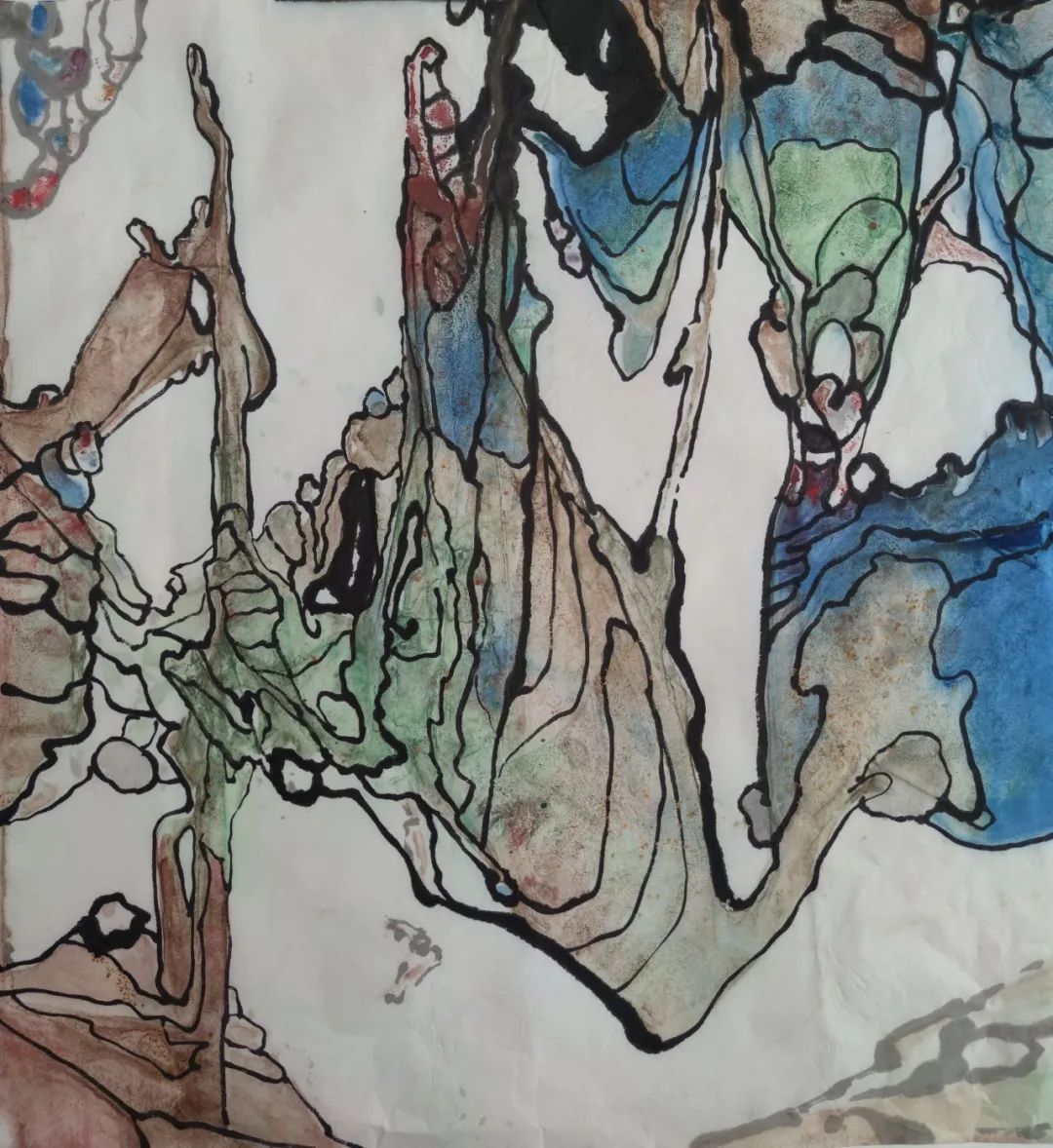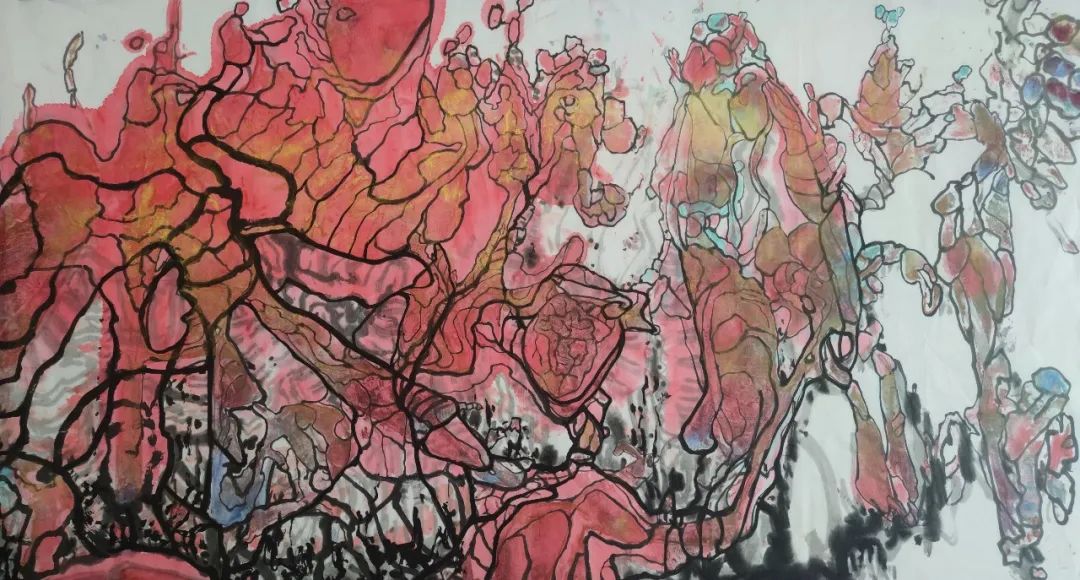 A4:用宣紙,中國(guó)畫(huà)的這些材料來(lái)表現(xiàn)我的抽象風(fēng)格,是因?yàn)槲业某橄罄镞呌泻艽蟮奶攸c(diǎn)就是,它很強(qiáng)調(diào)偶然性和不確定性。這種偶然性,不確定性和隨機(jī)性,用宣紙和中國(guó)畫(huà)的這一套材料是比較適合的。我用的宣紙,有的時(shí)候用的半生半熟的,有的時(shí)候用生宣,有時(shí)候用那個(gè)云皮紙,我不是很在意這個(gè),包括用顏色,我今天可能是這樣調(diào),下次可能是另外一種方法調(diào),然后用筆也是,一下子用狼毫一下用羊毫,一時(shí)粗一時(shí)細(xì),都是由著當(dāng)時(shí)的心情和感覺(jué)來(lái)。跟書(shū)法寫到一定境界,筆是隨著人的心境,狀態(tài),所處的思想去走一樣的道理。
