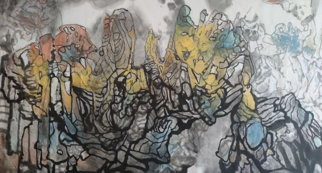 A3:繪畫(huà)當(dāng)中的任何一個(gè)語(yǔ)言,它必須要和人們的認(rèn)知要發(fā)生聯(lián)系。其中很重要的一個(gè)元素就是筆墨,我對(duì)我繪畫(huà)中的筆墨是這樣理解,它是一種情緒的表達(dá),也就是我的情緒通過(guò)筆墨的快慢,粗細(xì)去表達(dá)。第二個(gè),顏色,人們通過(guò)這個(gè)顏色可以想到什么,可以感覺(jué)到什么。第三,線條也是如此,粗線細(xì)線,這個(gè)線走得快,那個(gè)線走得慢,這個(gè)線轉(zhuǎn)折彎曲,粗細(xì)變化,疏密變化,它都能讓人對(duì)應(yīng)的產(chǎn)生一種感覺(jué)。我的繪畫(huà)當(dāng)中就試圖用這些元素讓它和我要表達(dá)的意圖和我的情緒發(fā)生某種聯(lián)系。我要提高的就是它和我發(fā)生了聯(lián)系,它能不能和觀眾也有相同的聯(lián)系?這就是我要不斷在繪畫(huà)上追求的。
