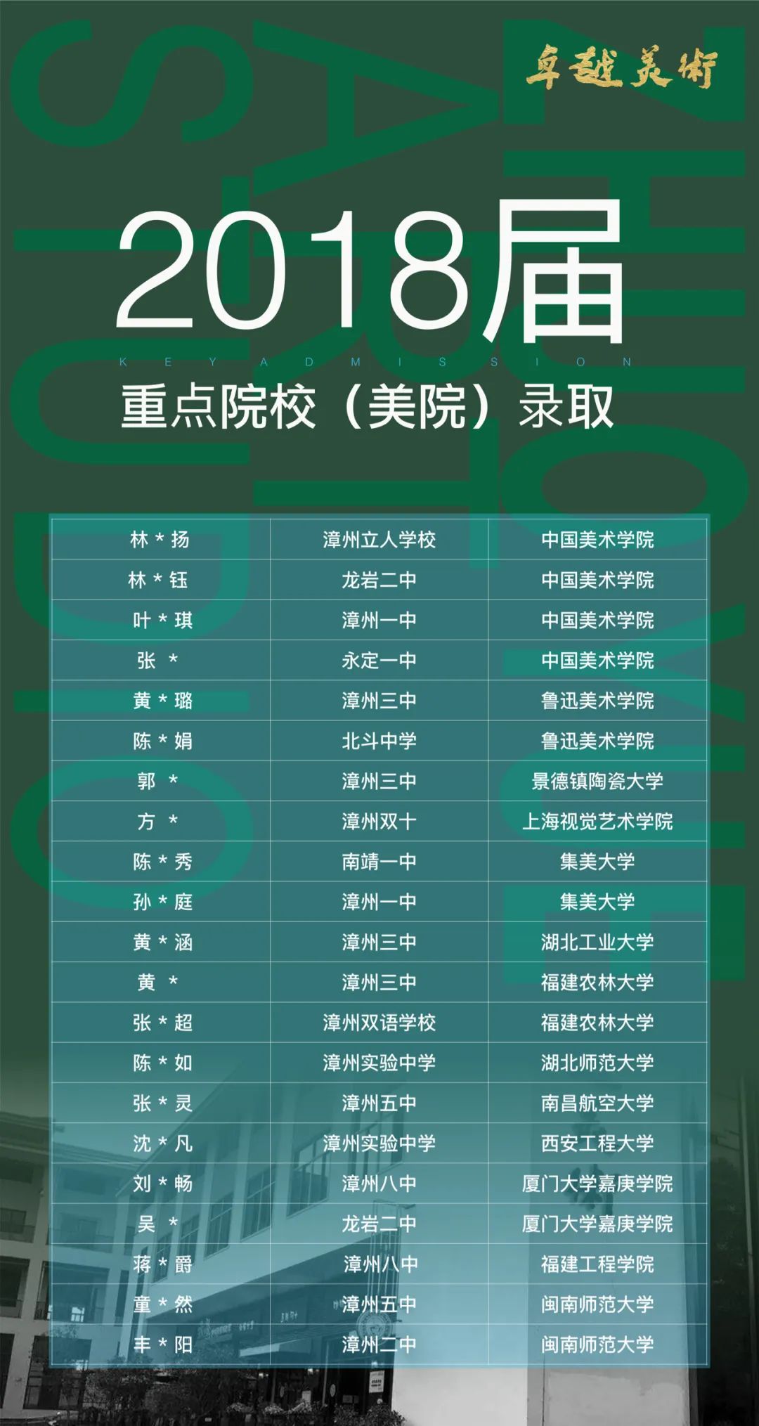 至創(chuàng)辦以來(lái)屢獲碩果,2012年陳玳鵬同學(xué)取得中國(guó)美院全國(guó)第2名,2014年沈晉同學(xué)取得中央美院全國(guó)第2名, 2015年22人次專(zhuān)業(yè)通過(guò)中國(guó)美術(shù)學(xué)院,林欣同學(xué)取得北京電影學(xué)院全國(guó)第6名... 2019年福建省聯(lián)考孫伯淵同學(xué)取得全省第12名,2020年專(zhuān)升本李煜翎以專(zhuān)業(yè)287分(滿分300)奪得全省第1名,2021年中職生王曉薈專(zhuān)業(yè)奪得188高分(滿分200),2022年福建省聯(lián)考黃仲麟同學(xué)取得全省第31名、顏一心取得全省第63名..2023年中職生葉碧玲同學(xué)以總分694取得全省第1名..等佳績(jī), 現(xiàn)已為漳州地區(qū)輸送近千名中央美院、中國(guó)美院、天津美院、北京服裝學(xué)院、北京電影學(xué)院、廈門(mén)大學(xué)、福建師范大學(xué)、廈門(mén)工藝美術(shù)學(xué)院等重點(diǎn)院校學(xué)生,卓越美術(shù)是為漳州學(xué)子實(shí)現(xiàn)美術(shù)夢(mèng)想的搖籃,讓我們共同努力,成就未來(lái)!