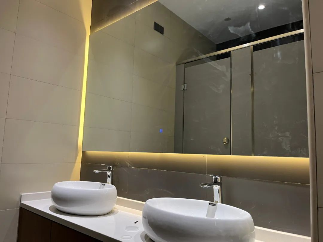 洗手間男女區(qū)獨(dú)立,鏡子帶背發(fā)光燈更有藝術(shù)感