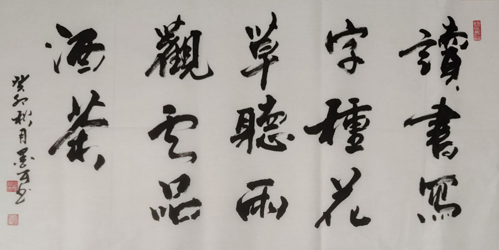對(duì)于較好書法作品的評(píng)價(jià),古人早有所論,謂之“好書之體,須入其形,若坐若行,若動(dòng)若飛,若往若來,若臥若起,若愁若喜,若蟲食木葉、若利劍長(zhǎng)戈、若強(qiáng)弓硬矢,若水天、若云霧、若日月,縱橫有力象者,方得謂之書”。這無非說明,好的書法中所有的點(diǎn)畫形體必須是處處能夠激起人們對(duì)現(xiàn)實(shí)中多樣美的形體與動(dòng)態(tài)的聯(lián)想,這才算得上藝術(shù)。事實(shí)也正是這樣。好的書法總是給人一種圓滿耐看、神采奕奕舒服的感覺,觀之令人心慰神快。好的作品中,墨也扮演著重要的作用。