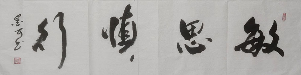 在三種不同的墨法中,使?jié)饽?,?yīng)力戒墨濃得不適當(dāng)而出現(xiàn)“墨豬”,這樣的滯筆會(huì)顯得臃腫、沒有精神,所以沒有把握不宜多用;使用燥墨,沒有基礎(chǔ),也盡量不要使用,否則寫出的字缺乏筋肉,沒有風(fēng)采,干巴巴的不耐看;而用燥墨得法者,就會(huì)顯得骨力外拓,效果較佳;使?jié)櫮?,寫出的字清秀俊媚,骨肉協(xié)調(diào),柔中見剛,所謂多骨微肉者謂之“筋書”正是這個(gè)意思,使墨應(yīng)該朝著這個(gè)目標(biāo)奮斗。這里,還簡(jiǎn)單談及一點(diǎn)“催墨”。何謂健墨?就是毛筆藏墨后,投入運(yùn)行,當(dāng)一氣之筆達(dá)到一定程度,要表達(dá)的意思還沒有寫完,或者書家的激情奮起而行筆不能止,但筆鋒內(nèi)藏墨即將用盡,墨即盡而意未盡,怎么辦?那就要行筆急速,略用力下按,勢(shì)來不可止,將筆頭內(nèi)余墨催到毫端鋪于紙上而形成“飛白書”的效果。這種方法運(yùn)用得好,可使人領(lǐng)略到別具一格的險(xiǎn)峻意境??偠灾瑵?rùn)可取姸,燥可取險(xiǎn);潤(rùn)燥互滲,險(xiǎn)才能險(xiǎn)出氣勢(shì),潤(rùn)才能托出風(fēng)韻。