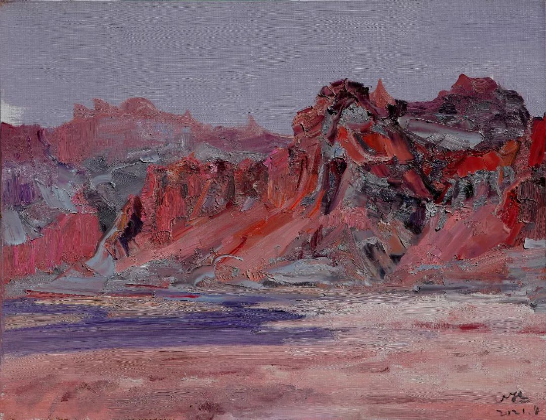 回過頭來看,盧野眼皮底下的綠色草原、鐵青色戈壁灘和金色沙漠,紛紛騎在雜色駝背上,沙塵暴和遠(yuǎn)古的駝鈴,映滿了他的畫布,像這個(gè)黃昏的一場電影。當(dāng)我返觀他以前的精美乏味的抒情意象和記錄感覺經(jīng)驗(yàn)的畫面,覺得自己正在斜穿新疆大地,發(fā)現(xiàn)他隔著千年的時(shí)光,又能夠點(diǎn)亮遠(yuǎn)古時(shí)代的景色,這讓觀者正好翻到新疆文化史的某一頁。這足以表征他的藝術(shù)日益走向成熟,藝術(shù)語言越來越具有獨(dú)立的品格。