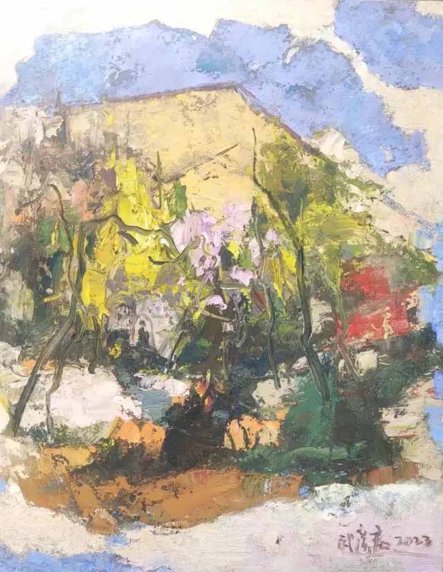 武彥君的油畫自然呈現(xiàn)了他想要的簡逸、放達的意境。在寫生當中通過畫筆去表現(xiàn)感受,把鮮活的山水人文氣息概括、提煉、物化為有表現(xiàn)性的色彩和形態(tài),他的作品力求詩性和筆墨意味的表達。