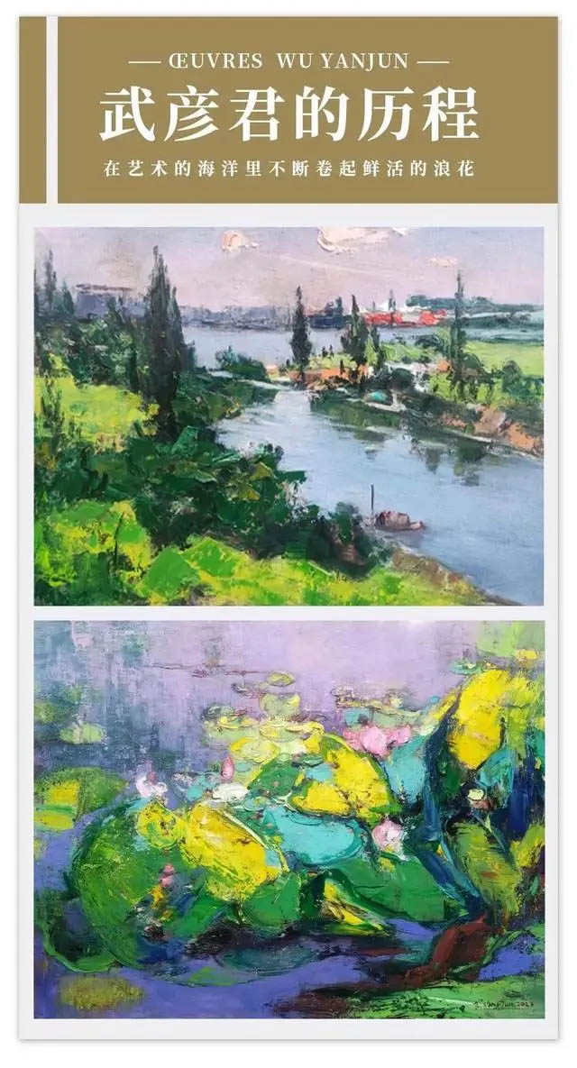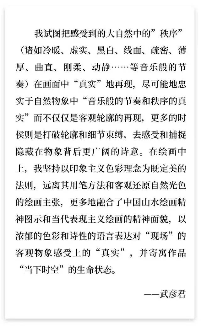 (吳昌碩語)他以金石氣蘊寫意入畫,喜愛綠色、藍色和紫色,用色強烈、用筆老辣,在扎實寫實、熟練寫實的西洋繪畫功底上,武彥君已經(jīng)形成了蒼翠寫意、古樸雄渾的風景油畫風格。