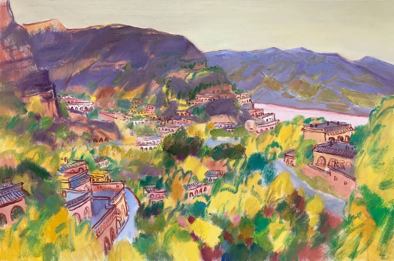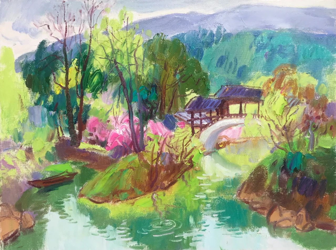 中國油畫家的色彩表現(xiàn),不乏凝重者,也不乏沉穩(wěn)者,但像宋衛(wèi)東這樣絢麗明亮者相對較少;他的繪畫在于色彩關(guān)系對立而產(chǎn)生的碰撞,形成了交響樂般的視覺張力。近年來,他游走于各地的山山水水,鄉(xiāng)間田頭,名勝古跡,彰顯了一位寫生畫家豐富的視覺閱歷,對油畫風(fēng)景作出了方向性探索,甚至不斷發(fā)酵形成了相對獨(dú)立的面貌。作為一位優(yōu)秀的畫家,最為可貴的莫過于逐漸建構(gòu)自己的藝術(shù)風(fēng)格。風(fēng)格的形成既包括藝術(shù)家的性情稟賦,也包括探索過程中的不斷思考與積累,等等這些都基于宋衛(wèi)東不斷自覺并持續(xù)探研的從藝態(tài)度。他的畫面上沒有視覺意義上的遠(yuǎn)近,色彩與筆痕中不斷出現(xiàn)似曾相識的景象,一種洇滲在畫面中的色線透著某種光暈,傳遞出與自然的可親。