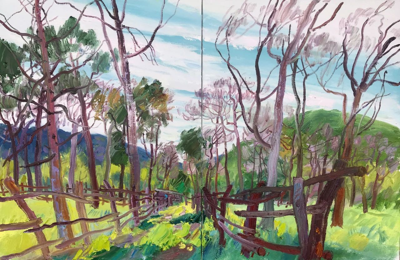 透過宋衛(wèi)東筆下的山水、田園、樹木、建筑等,可以感受到鮮活的生命張力以及強(qiáng)勁的思想穿透力。他的用筆縱橫交錯(cuò),這與傳統(tǒng)中國畫中的骨法用筆有幾分相似,可以說是有筆有色。宋衛(wèi)東大量的優(yōu)秀作品都是在寫生中完成,從他的大批作品中,既能看到畫家造形方面的的優(yōu)異技能以及概括能力,又同時(shí)看到他不同常人的構(gòu)圖取舍手法;他最擅長的魚眼視角,使得畫面結(jié)構(gòu)疏朗、開闊;畫面色調(diào)極具象征性、強(qiáng)烈濃郁的色彩和率性的筆觸傳達(dá)著畫家對自然與藝術(shù)間的個(gè)人感知,顯現(xiàn)出表現(xiàn)性與象征性并存的藝術(shù)表達(dá)。至于構(gòu)圖中的很多意外和不同尋常,在我看來,和他早年即為著名的的攝影家眼睛有著很深的關(guān)聯(lián)。單從這個(gè)意義上講,宋衛(wèi)東的繪畫也是值得關(guān)注的。