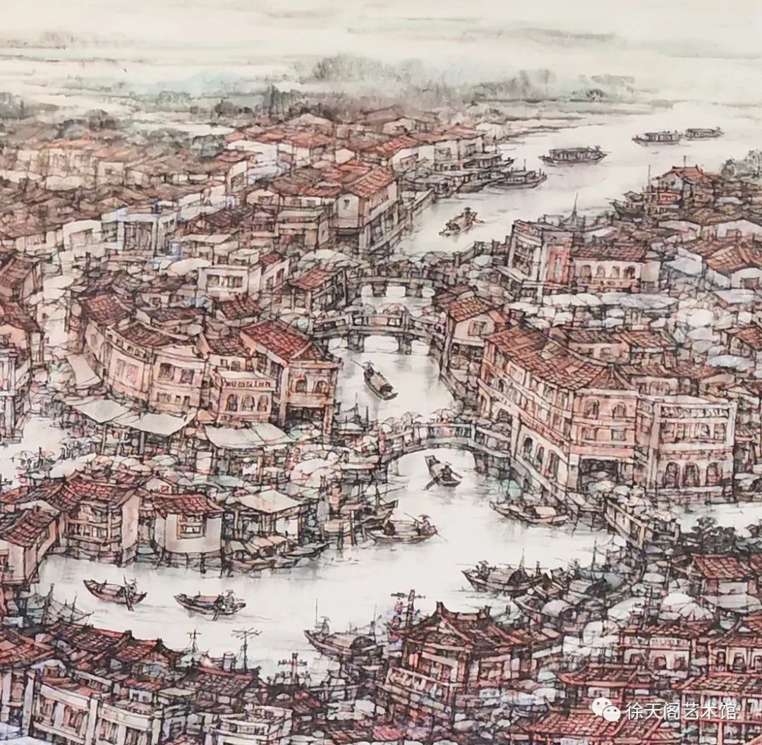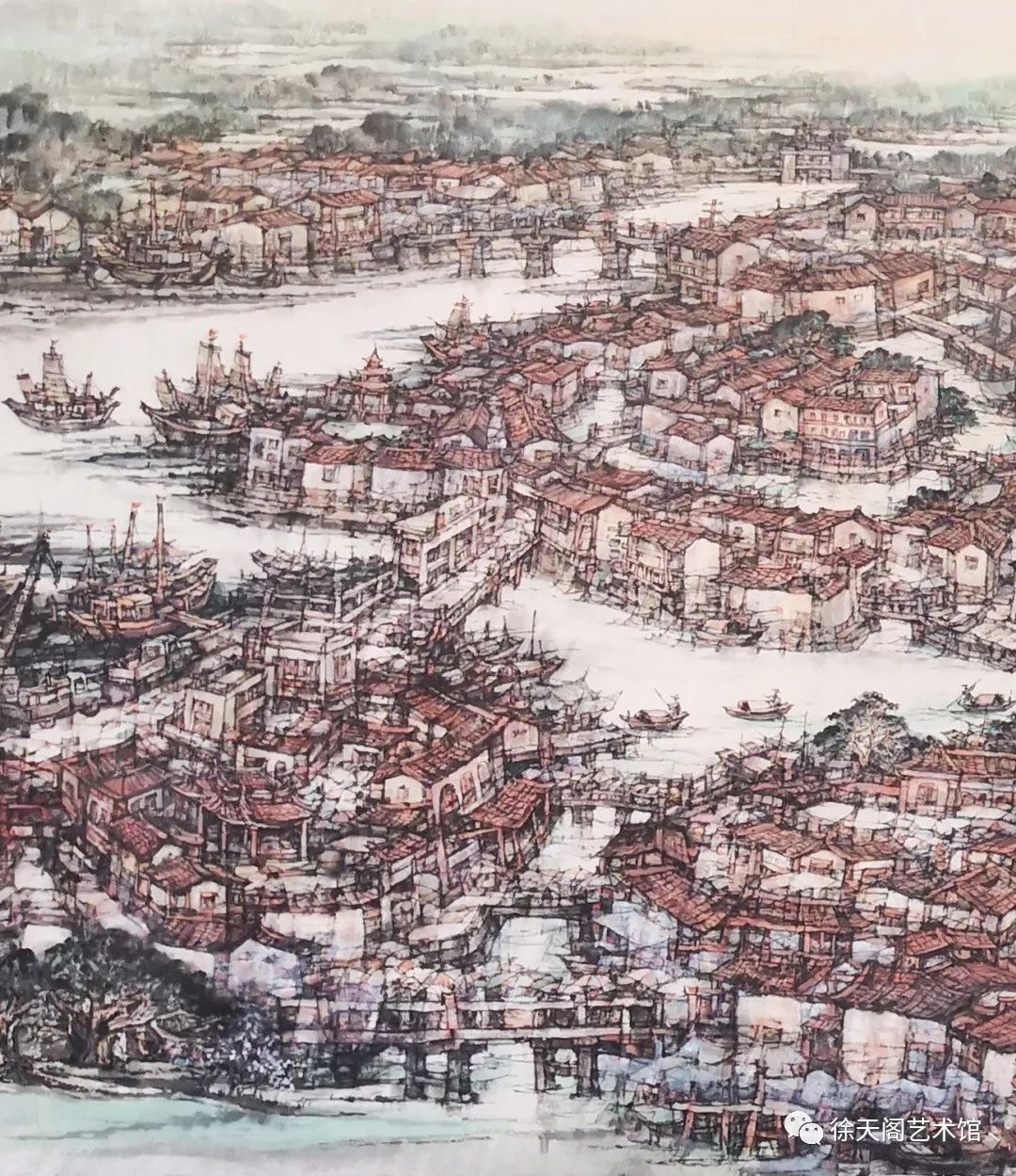 學(xué)仕根據(jù)童年時(shí)期的涵江地理位置特點(diǎn)進(jìn)行構(gòu)圖,以咸草頂三角埕為中心,把不同區(qū)域不同年代的地標(biāo)性建筑串在一起,全面反映農(nóng)耕時(shí)期商貿(mào)重鎮(zhèn)的真實(shí)面貌,表現(xiàn)出享有“小上海”盛譽(yù)的繁榮景象。在創(chuàng)作過程中,作者不是單純地對(duì)景物生搬硬套, 而是根據(jù)畫面的需要,借用水系穿插變化,豐富畫面的生動(dòng)性,通過紅磚厝的表現(xiàn)形式,強(qiáng)化古鎮(zhèn)的地域符號(hào),體現(xiàn)出作者既強(qiáng)調(diào)作品的文史價(jià)值,也突出作品的藝術(shù)價(jià)值的良苦用心。