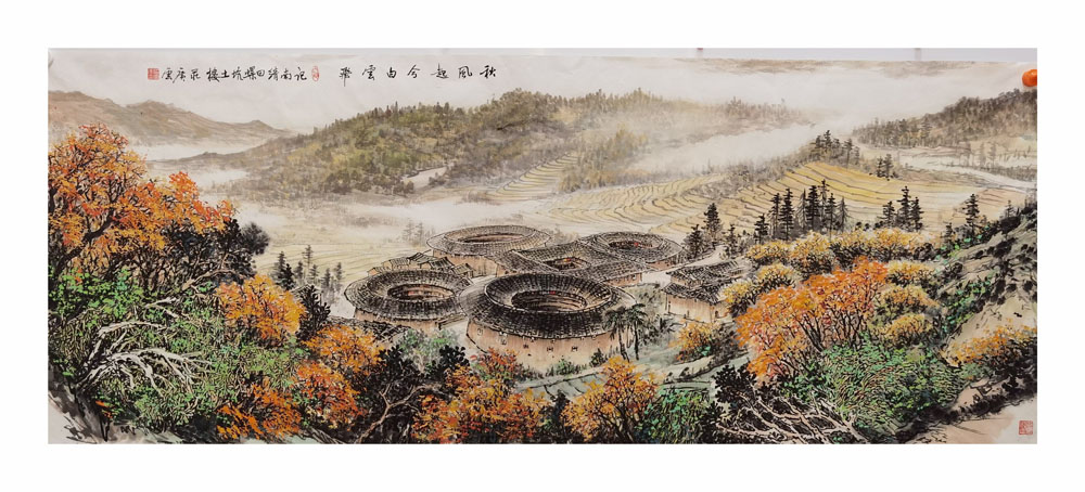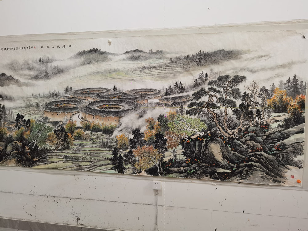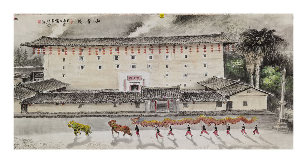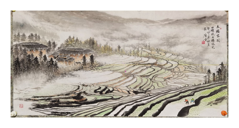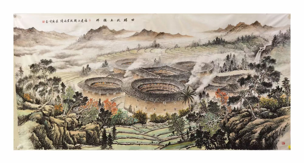 不僅如此,在畫面的筆墨表現(xiàn)和形式探索等方面上,莊廣云先生完全不同于匠俗畫作。一方面他是能以傳統(tǒng)的寫意功底為根基,筆墨的表現(xiàn)更是能和土樓環(huán)境相得映彰!臂如畫中的整體時(shí)節(jié)環(huán)境,就是屬于秋分之際,莊廣云先生以墨色的變化構(gòu)現(xiàn)時(shí)節(jié)氣象,在淋漓之間敷染出田野草木的蒸籠氛圍,而那高飽和度的墨色糅合,也無一不是能從側(cè)面充分展現(xiàn)出莊廣云先生的深厚功底!欣賞畫面,皆以土樓為中心主體,再以宏觀視角呈現(xiàn)山水環(huán)繞之境,而這種充滿張力感的畫面布局結(jié)構(gòu),自然也就是能夠牢牢把握住觀賞者的視覺神經(jīng),猶如親臨眼前,風(fēng)景引人入勝,鄉(xiāng)韻濃厚至極