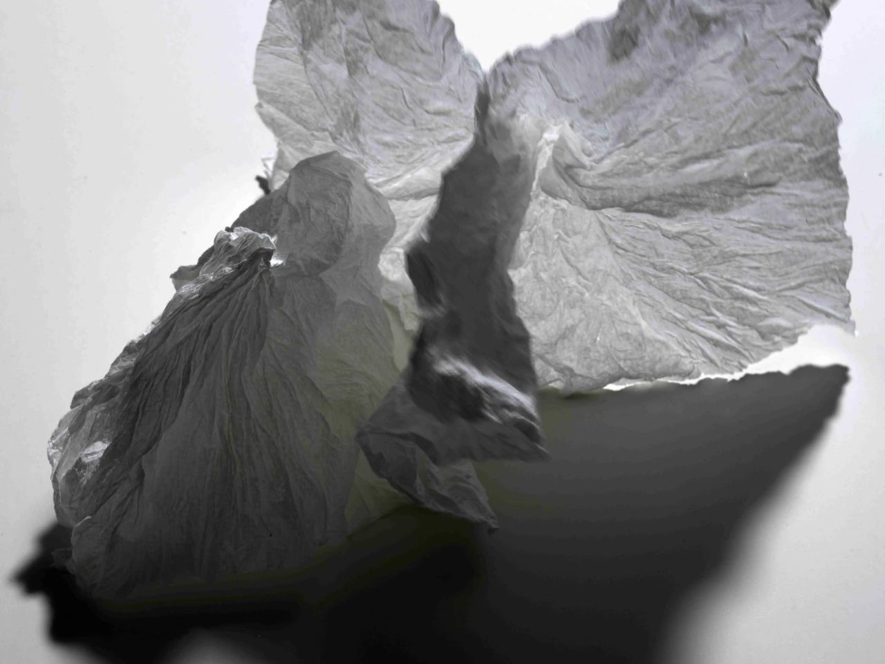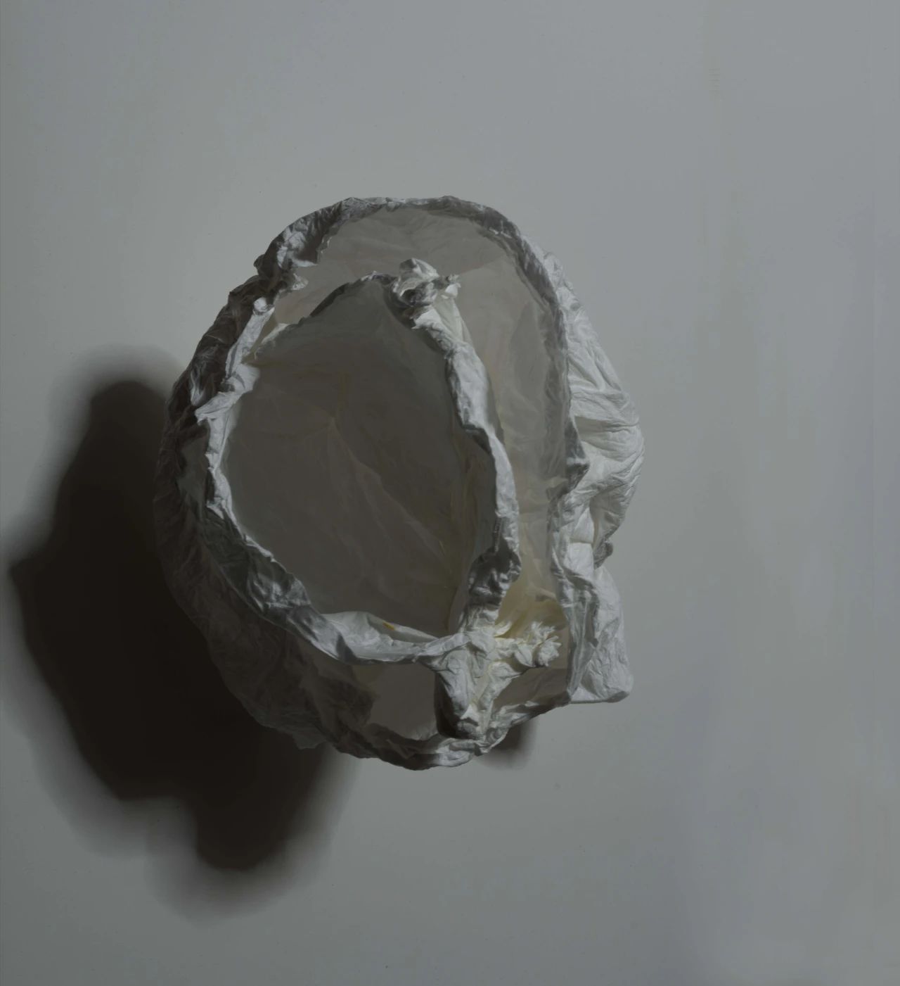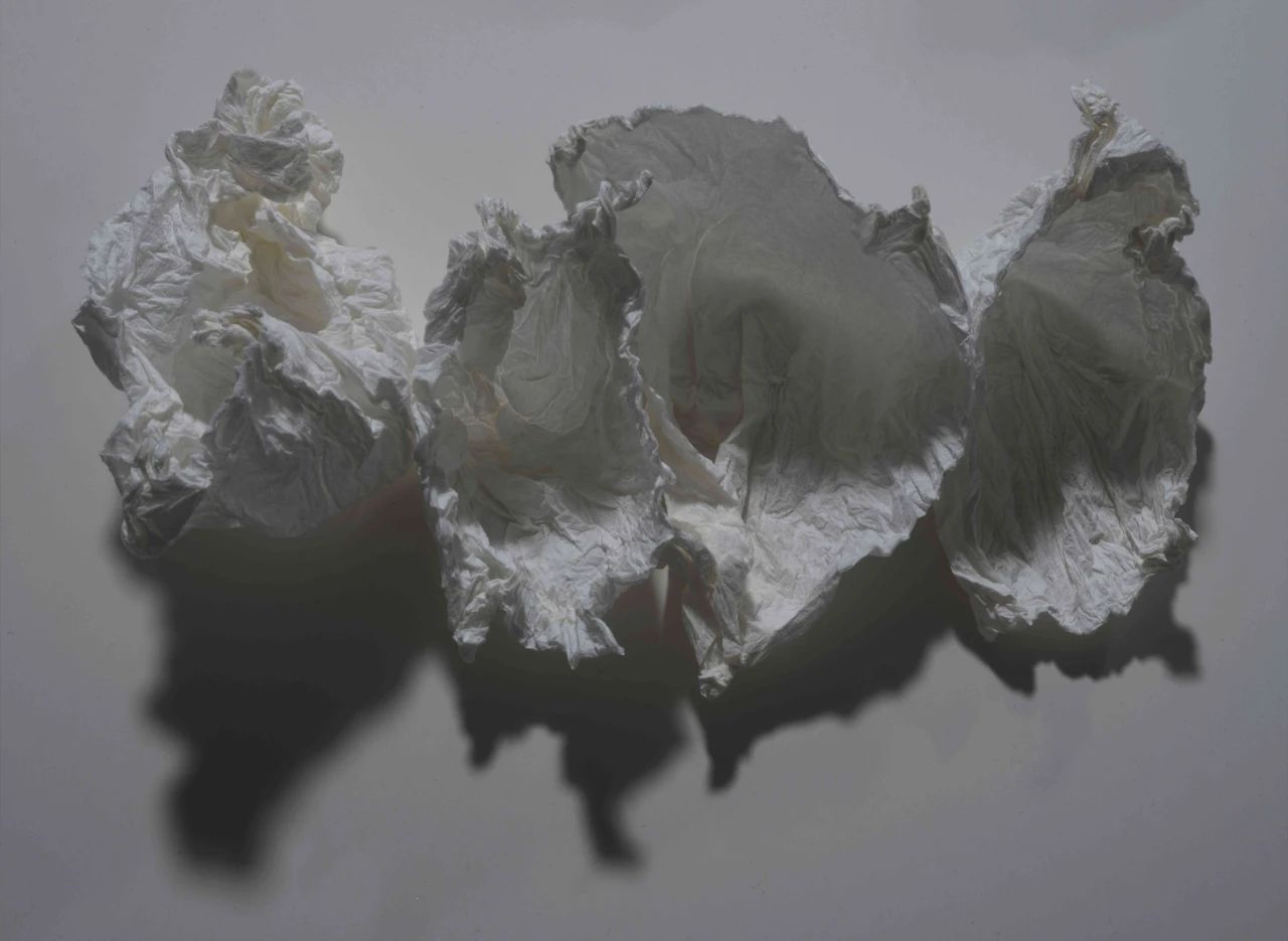 對于一個嘗試過很多種材質(zhì)做過幾十年水墨作品的藝術(shù)家老赫,突然放棄了一切,就是從手邊的紙巾,開始揉捏,然后通過攝影,以相紙或者亞麻布打印出來,在平面上形成獨特的陰影,卻具有立體的雕塑感與獨特的陰影效果。