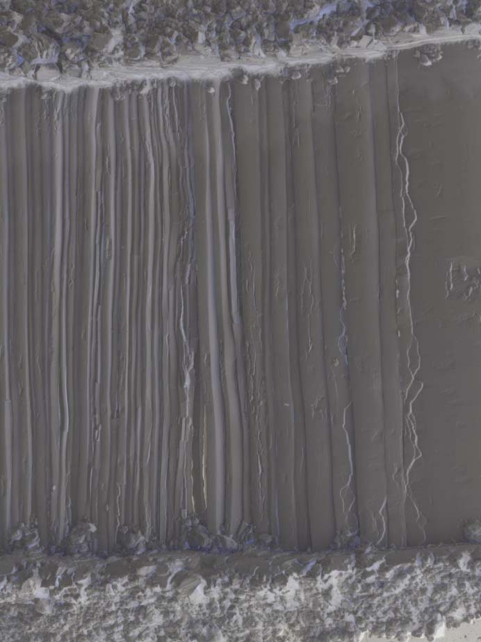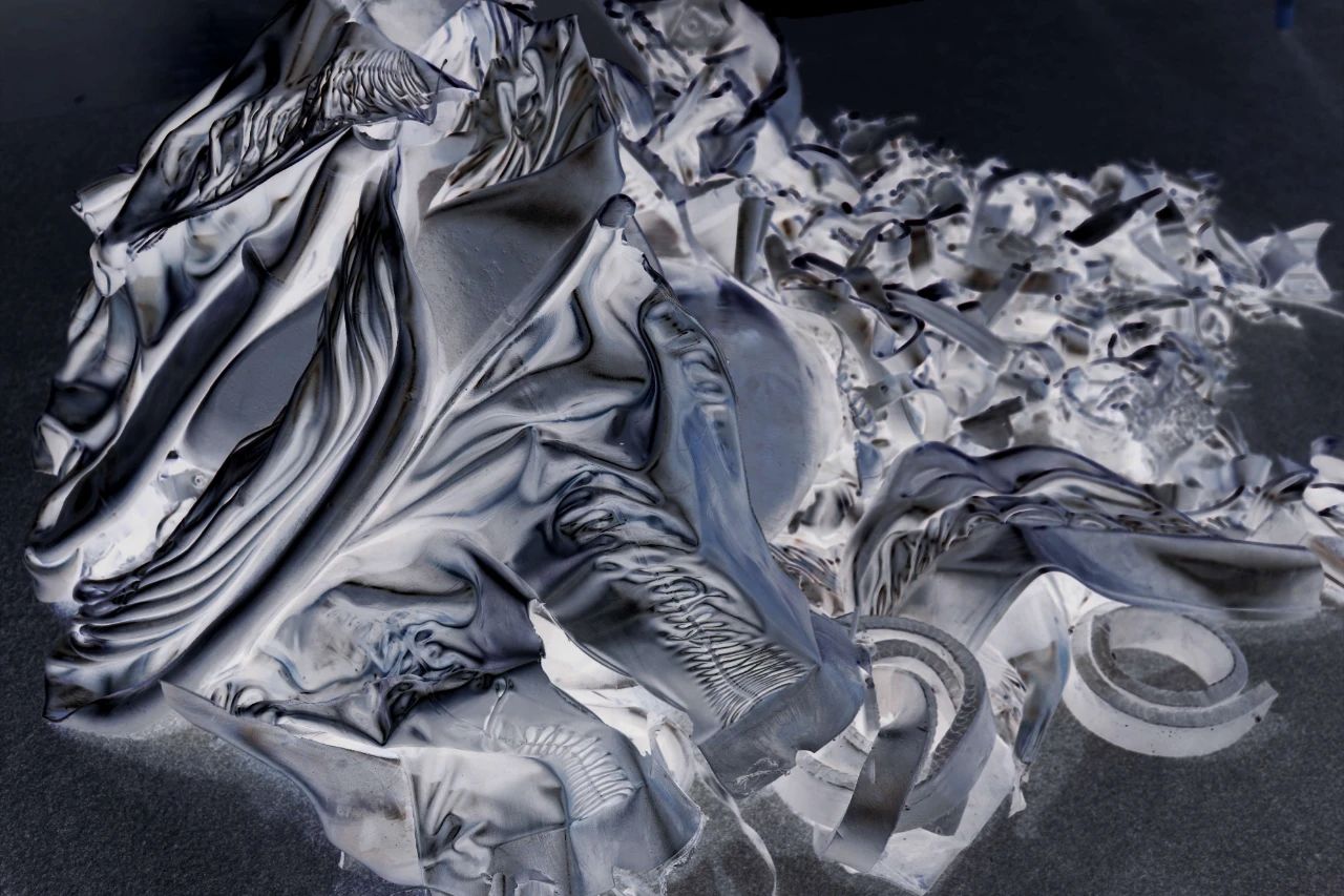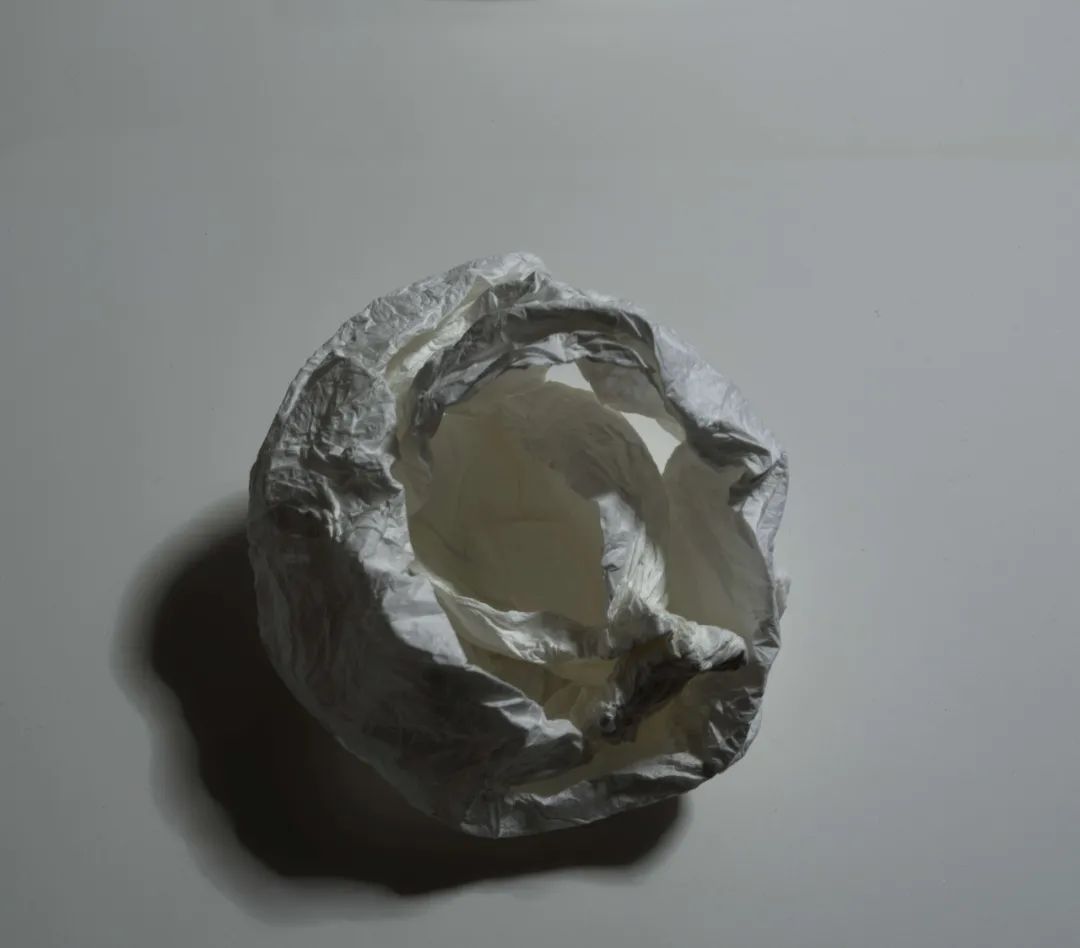 老赫如同魔術(shù)師,以這個平淡無奇的材質(zhì)與動作,在揉皺的過程中,以不同工具施加力量,造成紙張的獨特皺褶效果,乃至凸凹觸感,一切的秘密在于凸凹觸感,而且在拍攝時,會給所拍攝的紙褶凸凹,以道具的布景感,老赫仿佛成為了一個道具師或?qū)а?,給這些物布置獨特的光線效果,使凸凹呈現(xiàn)出光影的靈暈。