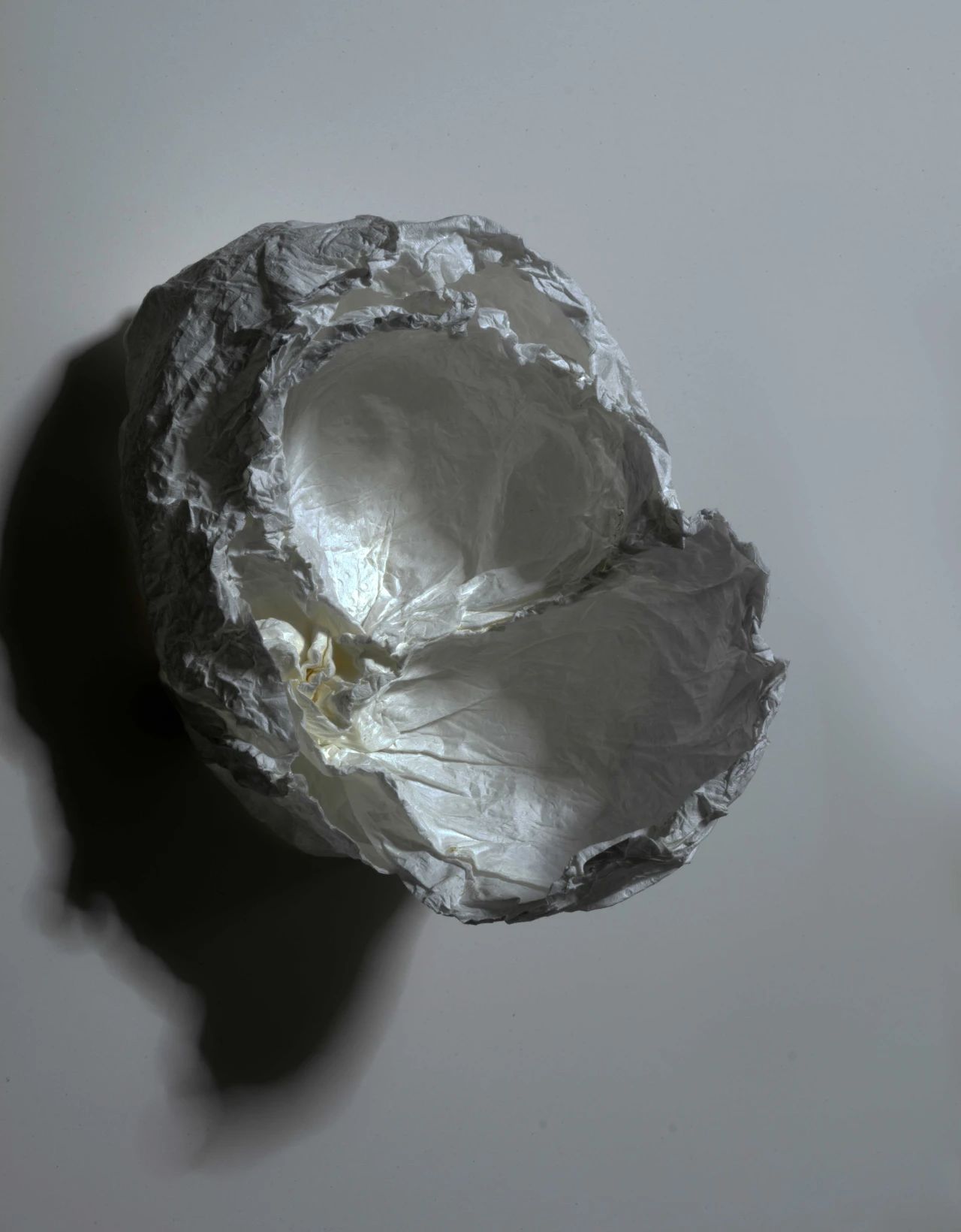 老赫一直要發(fā)現(xiàn)“上帝的體毛”,攝影所帶來的虛影,衛(wèi)生紙的白色以及在拍照時帶來的影子,或者黑度,或者灰色,在前景與后景的對比中,帶來微妙的空間深度。此白堊紀的白洞,觸發(fā)了神秘的古意或荒寒的詩意,也打開了白洞的深度,如同卵巢的凹陷,喚醒了白之靈,讓欲望開花,回到水母游動激發(fā)的幻象,是生物性的宇宙記憶。通過人蛻式的皮膚還原,生成為世界的皮膚,白紙喚醒的皮膚觸感,也是皮膚細胞的再生性。
