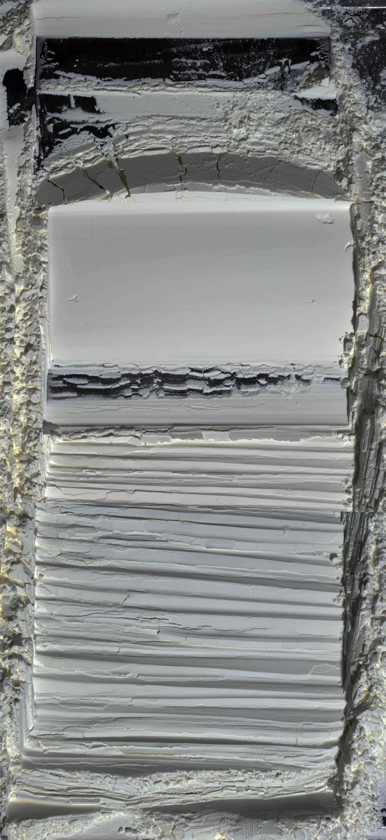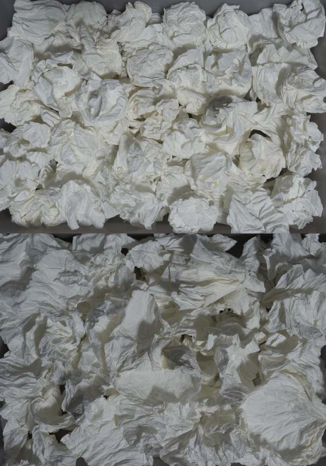 此“人蛻”的藝術(shù),也是靈魂過往的留痕與跡化,如同蟬蛻,蛇蛻,人蛻,也是整個世界精神之蛻,是大地靈魂之蛻。此人蛻的精神皮膚——似乎是靈魂走失后的殘留物,褶皺、印痕、劃道、凸起、凹陷、長短、曲直,這其中的節(jié)奏輕重、深淺都會引發(fā)不同的闡釋、解讀和聯(lián)想,形成了虛、空、白、幻、薄的觸感,每一幅都如此迷人,召喚觸摸,但又拒絕觸感,在此獨特的誘惑中,揉皺的衛(wèi)生紙,獲得了靈魂的肖像,也是人性蛻變的變形記。