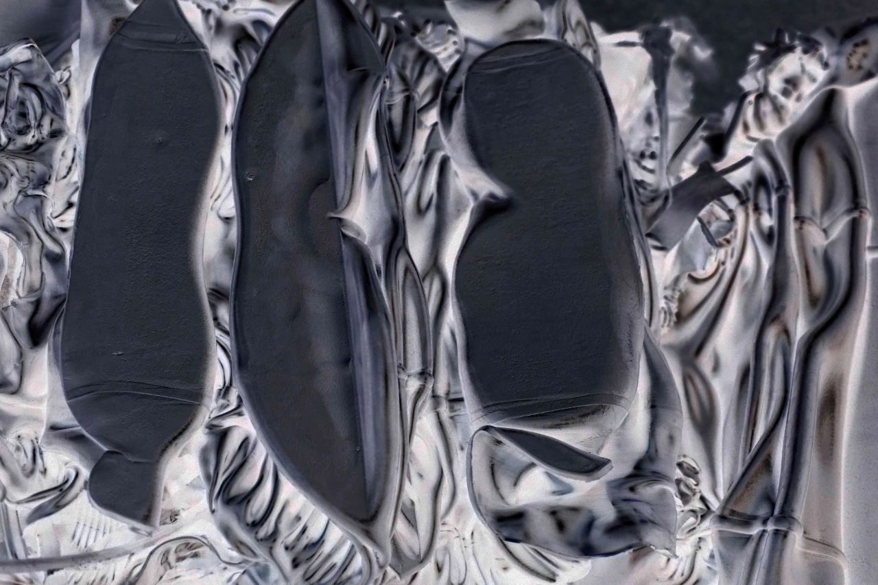 此擬似水墨繪畫的黑白對比,就是世界的白晝與黑夜,黑白向著光波轉(zhuǎn)換。與老赫之前繪畫的對照,形成繪畫的光波的震蕩,喚醒暗物質(zhì)的震蕩與折疊。