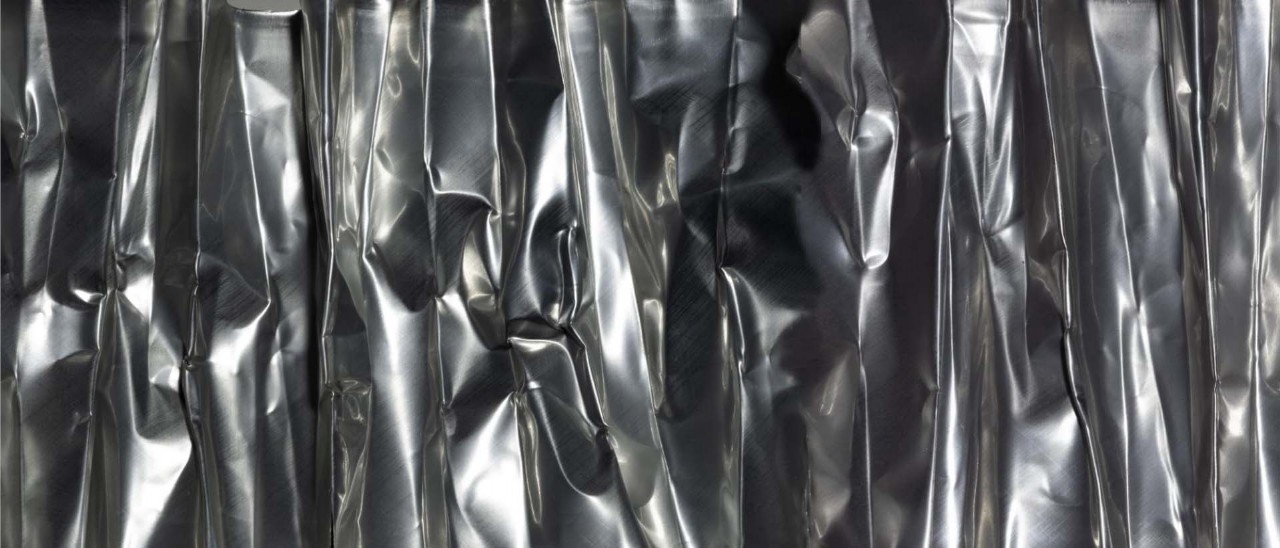 老赫除了使用廉價用而必棄之的餐巾紙,也以舊罐頭盒的馬口鐵來產(chǎn)生波光的皺褶,與自己之前的《光詩》繪畫進行對照,加強了金屬的質(zhì)感,在老赫這里,水墨乃是非水墨,以非水墨的材質(zhì)產(chǎn)生水墨性的光氣融合的褶子,與光波震蕩的宇宙韻律。