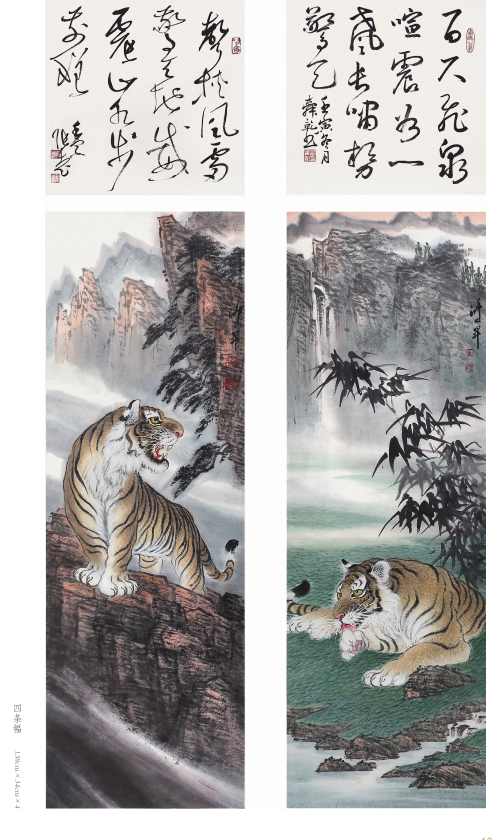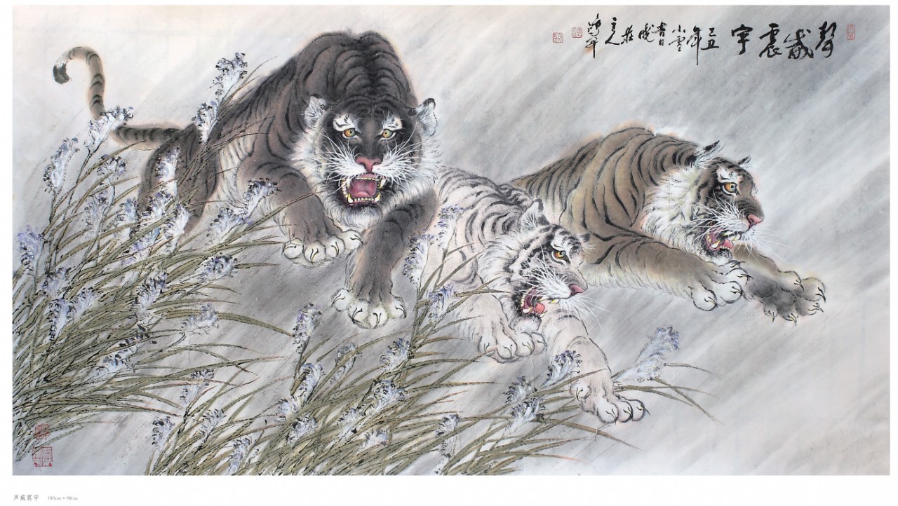 出于真正的愛好而畫畫,只要他喜歡的就認(rèn)真學(xué)、認(rèn)真畫。人物、花鳥、山水,他都畫過,畫虎,更是他所擅長的技藝。在部隊(duì)和工廠期間,曾以木刻的形式創(chuàng)作體現(xiàn)主旋律的人物畫,以現(xiàn)實(shí)生活題材為主,以表現(xiàn)時(shí)代精神為主題,士兵、工人是其畫作中的主要藝術(shù)形象,造型以寫實(shí)手法為主。這個(gè)畫風(fēng)也延伸到他的中國畫創(chuàng)作,他的花鳥主要采取小寫意畫風(fēng),造型栩栩如生,在形似的基礎(chǔ)上追求神似。他筆下的老虎刻畫精細(xì)、形象逼真,同時(shí),他又注重中國傳統(tǒng)繪畫的詩意表現(xiàn),老虎或在山林云水間盡情奔騰狂嘯、或閑庭信步、或傲視茫茫云海,情感深厚而又充滿驍健和自然的活力,令人精神振奮、豪情滿懷。