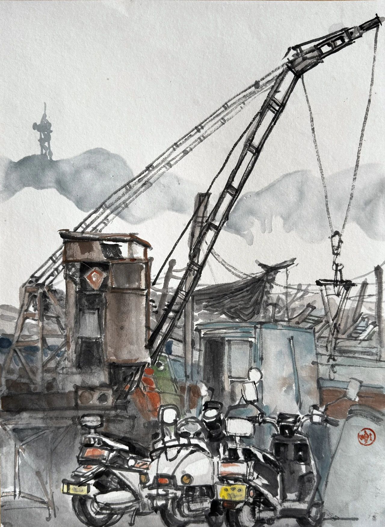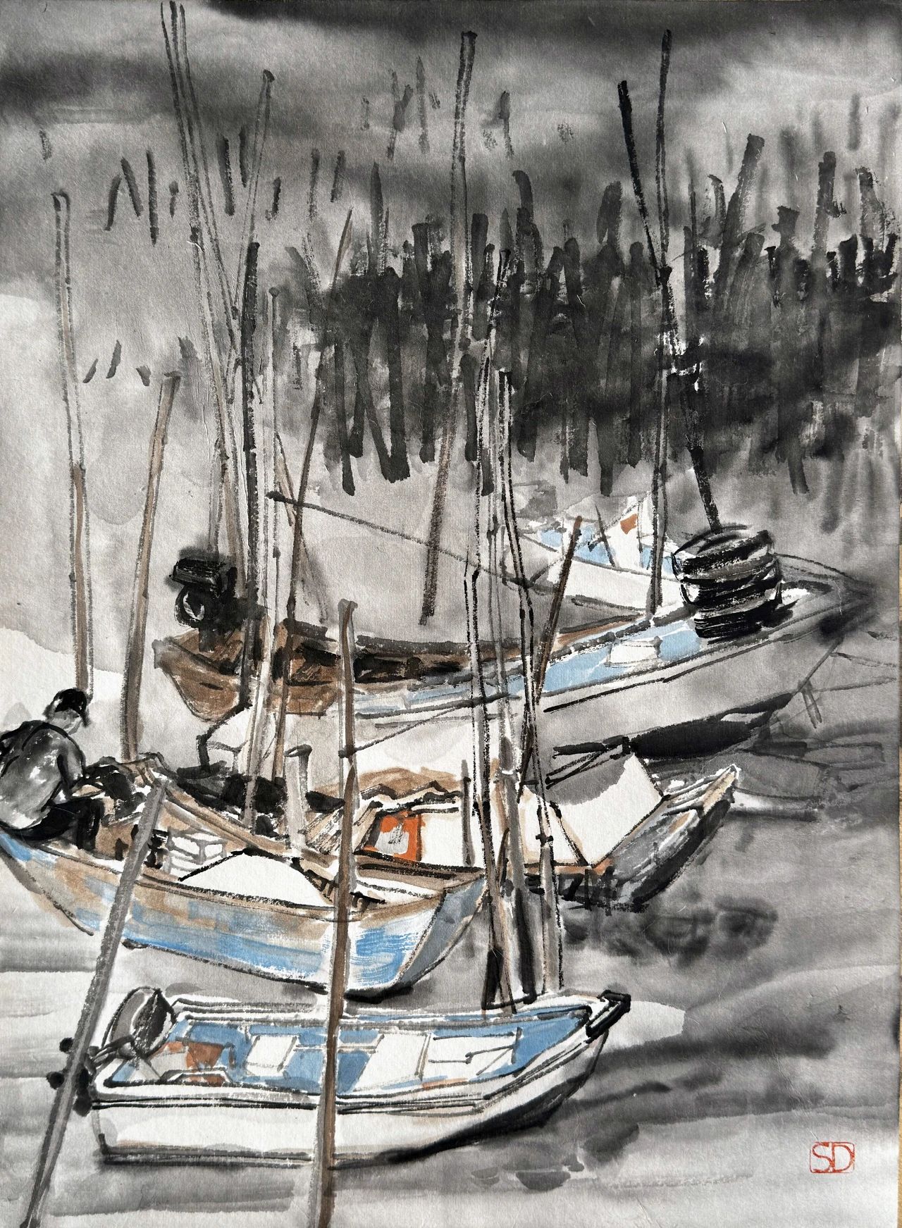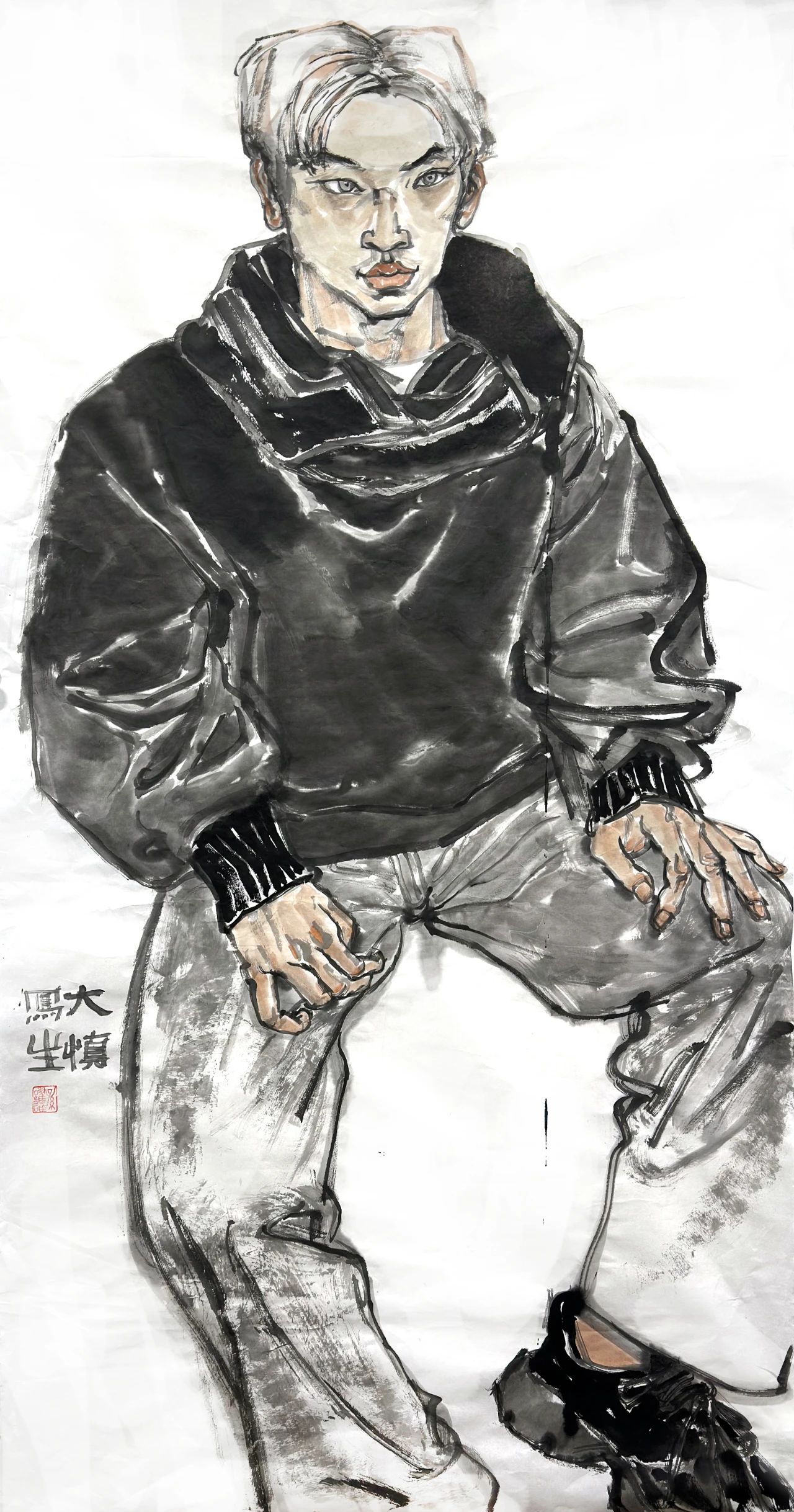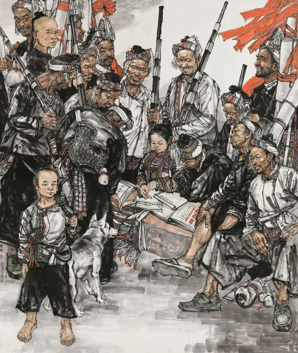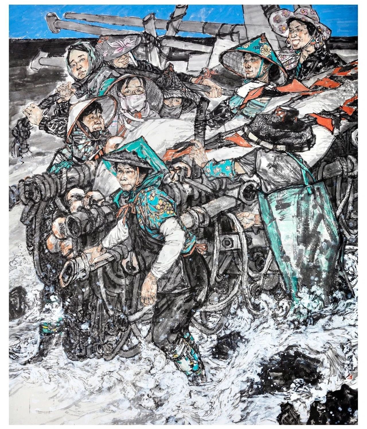孫躍雄的人物畫受到王新倫藝術(shù)觀念的啟發(fā),充分吸收“北派”雄渾、壯闊的風(fēng)格因素。他的系列作品充分關(guān)注新時(shí)代的審美意趣,線條粗獷、墨色鮮明,重視線的節(jié)奏與組合變化,常以飽滿的構(gòu)圖及大體塊的人體塑造,追求表現(xiàn)“豐碑式”的視覺(jué)效果,游走的墨線及鮮活的墨色渲染給人以極強(qiáng)烈的視覺(jué)印象,這種美學(xué)追求是當(dāng)代中國(guó)畫時(shí)代融入的重要?jiǎng)右?。新中?guó)成立之后,在“油畫民族化,國(guó)畫現(xiàn)代化”文藝政策的引導(dǎo)下,美術(shù)家追求表現(xiàn)時(shí)代氣象的步伐從未止步,以革命情懷、民族團(tuán)結(jié)、生產(chǎn)建設(shè)、時(shí)代楷模、城鄉(xiāng)發(fā)展等不同題材選擇與人民群體的塑造成為美術(shù)創(chuàng)作中的序列圖像。這種觀念的踐行體現(xiàn)在眾多現(xiàn)當(dāng)代人物畫家的美術(shù)作品之中,如石魯?shù)摹堆雍又稀?、黃胄的《藏童上學(xué)》、劉文西的《陜北老農(nóng)》、李琦的《主席走遍全國(guó)》、廣廷渤的《鋼鐵·汗水》、方增先的《說(shuō)紅書》、石齊的《風(fēng)雪大別山》、翁振新的《那一灣淺淺的海峽》、王新倫的《苗嶺春色》等,這些畫作是對(duì)時(shí)空流轉(zhuǎn)的多維解讀。孫躍雄自幼受到了良好的藝術(shù)啟蒙,尤其對(duì)水墨及書法的涉獵滋養(yǎng)著其對(duì)傳統(tǒng)的美學(xué)認(rèn)知。他的藝術(shù)成長(zhǎng)歷程見(jiàn)證著改革開(kāi)放的浪潮對(duì)“現(xiàn)代性”的最佳詮釋:由青年時(shí)代的藝術(shù)暢想,經(jīng)過(guò)美術(shù)院校的專業(yè)學(xué)習(xí),遇到“下海潮”的職業(yè)抉擇,直至奮斗與游歷后的重新審視,其早年埋藏于內(nèi)心的藝術(shù)種子在國(guó)畫現(xiàn)代轉(zhuǎn)型的新境中再次萌發(fā),自此便一發(fā)不可收拾。孫躍雄看似淡然敦厚的個(gè)性,實(shí)際與筆墨所涵養(yǎng)的性靈具有相當(dāng)?shù)耐恍云焚|(zhì),其敏銳的視角既是對(duì)時(shí)代美學(xué)的捕捉,更傳達(dá)著過(guò)往間的無(wú)聲吶喊,時(shí)代的洪流成為畫家腦海中的最美影像,簇?fù)碇溆峦鼻暗哪_步。這種對(duì)過(guò)往的深沉回味,從他的畫作《東海漁歌》系列作品中展露無(wú)遺,這是畫家成長(zhǎng)軌跡的一種表達(dá),其以極為獨(dú)特的視角將時(shí)代發(fā)展維度中的圖像進(jìn)行著拉伸、疊加與重合。那些氣勢(shì)恢宏的勞作場(chǎng)景不僅展現(xiàn)了濃郁的生活情感與地域風(fēng)情,更是對(duì)新時(shí)代的描寫與謳歌:黎明的曙光掠過(guò)每個(gè)勞動(dòng)者的面龐,一絲溫存輕撫著粗獷的肌膚。僅此一刻,卻點(diǎn)燃了奮斗的澎湃激情,堅(jiān)定、勇猛、團(tuán)結(jié)的信念更能讓人身臨其境,定格于瞬間的精彩激發(fā)著讀者的聯(lián)想,促使著畫面無(wú)限周延,影像中的片段即有了史詩(shī)般的敘事可能。