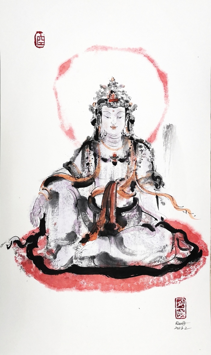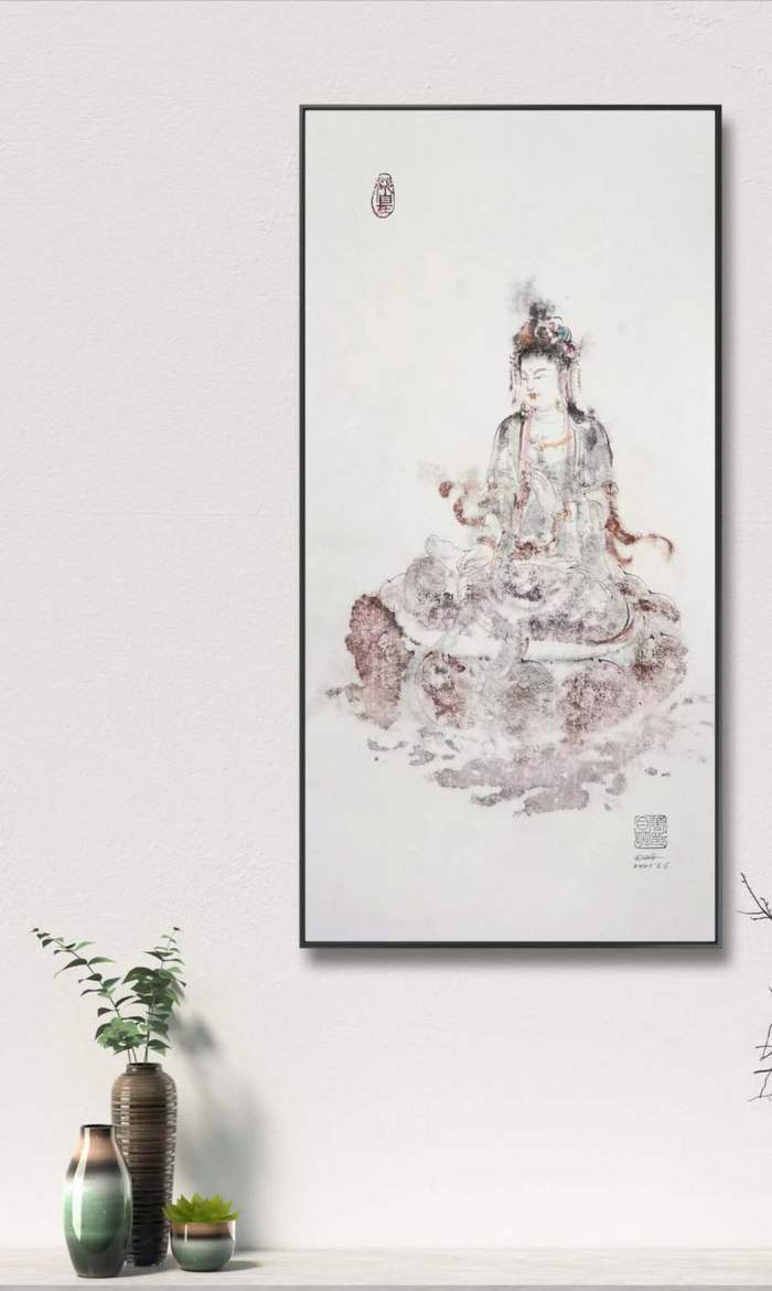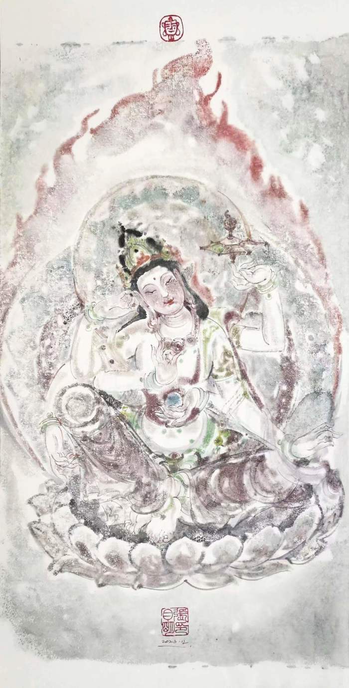 在創(chuàng)作中,張月明非常注重人物氣質(zhì)的捕捉和表現(xiàn)。他通過細膩的筆觸和準確的造型,將菩薩等佛教人物的形象塑造得栩栩如生,展現(xiàn)出一種超凡脫俗的氣質(zhì)。他不僅關注人物的外在形象,更注重通過畫面?zhèn)鬟_出人物的情感和精神內(nèi)涵,這讓他的作品不僅僅是簡單的形象再現(xiàn),更是對佛教文化精神和人物情感的深刻詮釋。