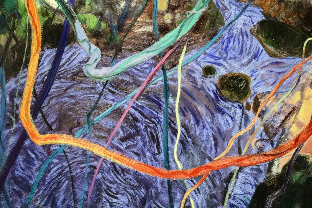 更重要的是,借由藤蘿,他說(shuō)他想到他的母親。一個(gè)一生都在大山里艱辛勞作的農(nóng)村婦女,面對(duì)生活的困境卻堅(jiān)韌智慧;面對(duì)命運(yùn)的轉(zhuǎn)折卻無(wú)懼無(wú)悲;面對(duì)生命的挑戰(zhàn)卻始終都信仰未來(lái)有光,她的生命和頑強(qiáng)生長(zhǎng)的藤蘿異構(gòu)同質(zhì)。因此藤蘿系甲油畫(huà)系列,那筆觸勾勒出的每一處紋理,仿佛能感受到它們?cè)谏L(zhǎng)、蔓延過(guò)程中的生命律動(dòng),寄寓著對(duì)母親的深情,同時(shí)也寄寓著對(duì)每一個(gè)普通的生命在殘酷的自然和復(fù)雜的現(xiàn)實(shí)中穿行時(shí)頑強(qiáng)的意志,以及被命運(yùn)眷顧的美好祝愿。