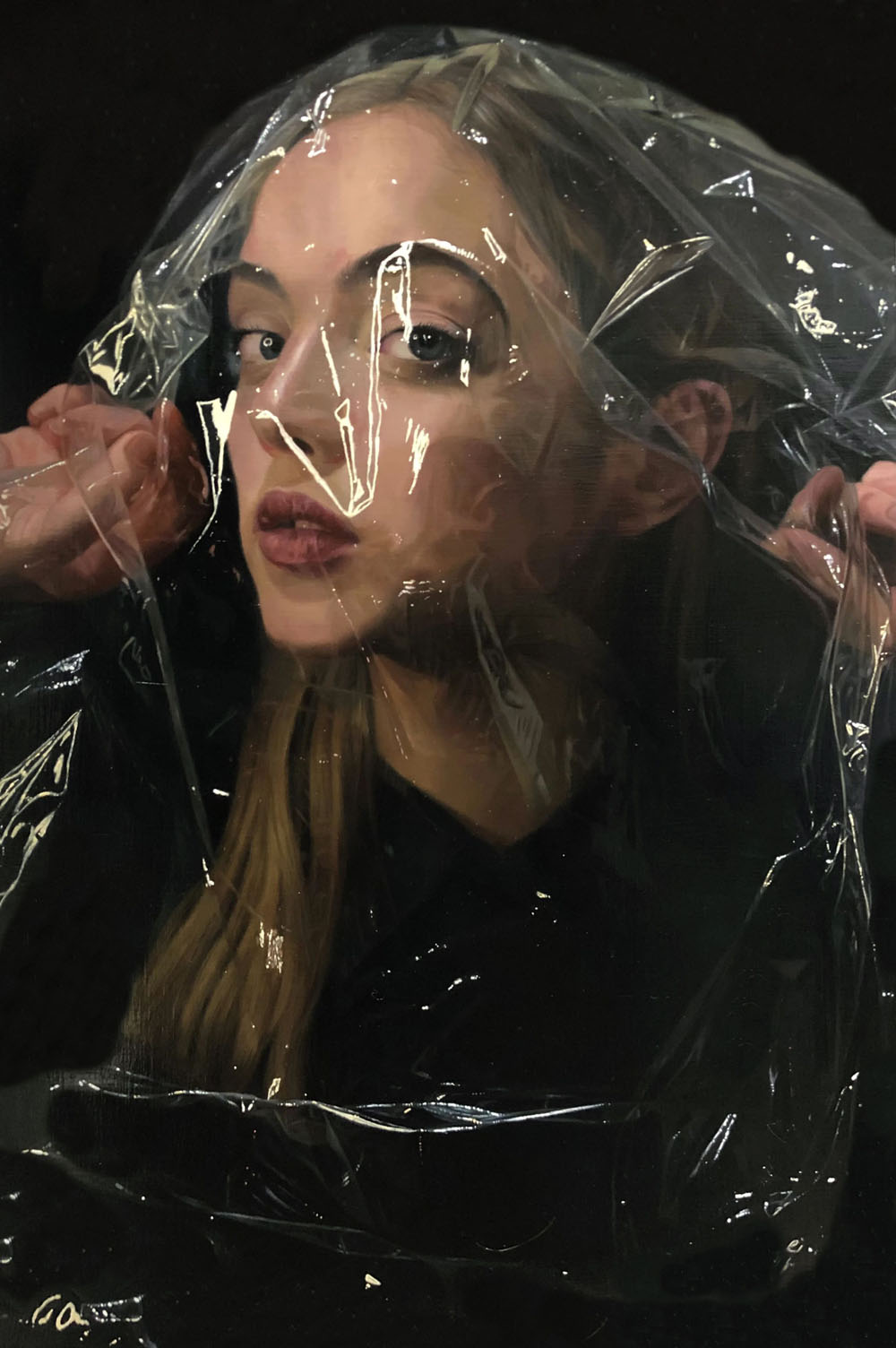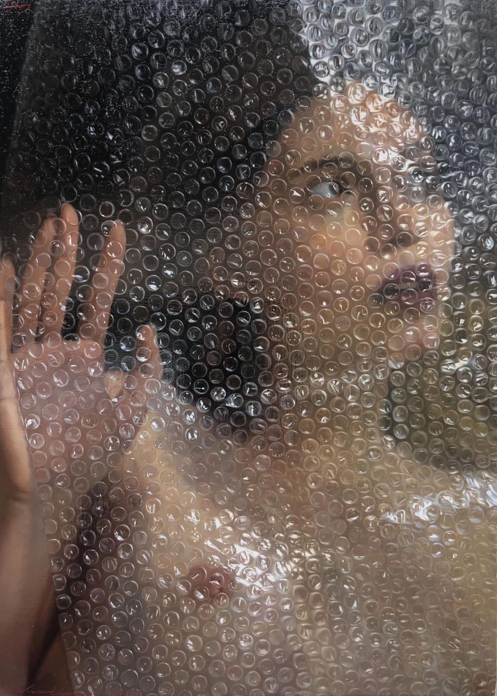 劉昊天的“浮生系列”是其寫實油畫階段探索的又一全新成果,以“浮生”為主旋律的一批帶有“塑料薄膜”的作品,為我們展現(xiàn)當(dāng)下社會在飛速發(fā)展之下,人類在大環(huán)境面臨的種種壓力,由之帶來對于社會、環(huán)境等問題的思考。有喜有憂,有笑有淚,我們?nèi)缤涣m埃,在宇宙之間如此渺小但又不可替代。浮生若夢,浮生未歇,人生始終沒有定論,我們可以虛度和享受時光,進(jìn)而試圖尋找人生真正的價值。
