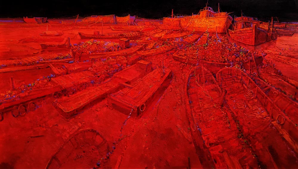 朝陽港系列:海滄有好幾個避風港,停靠在港灣的船只各具特色,斑駁的船體歷盡滄桑,歷史感十足。承載著海滄漁民的過去,通過紅色調象征著朝陽,暗黑色的背景通過對比使畫面更加主體突出。