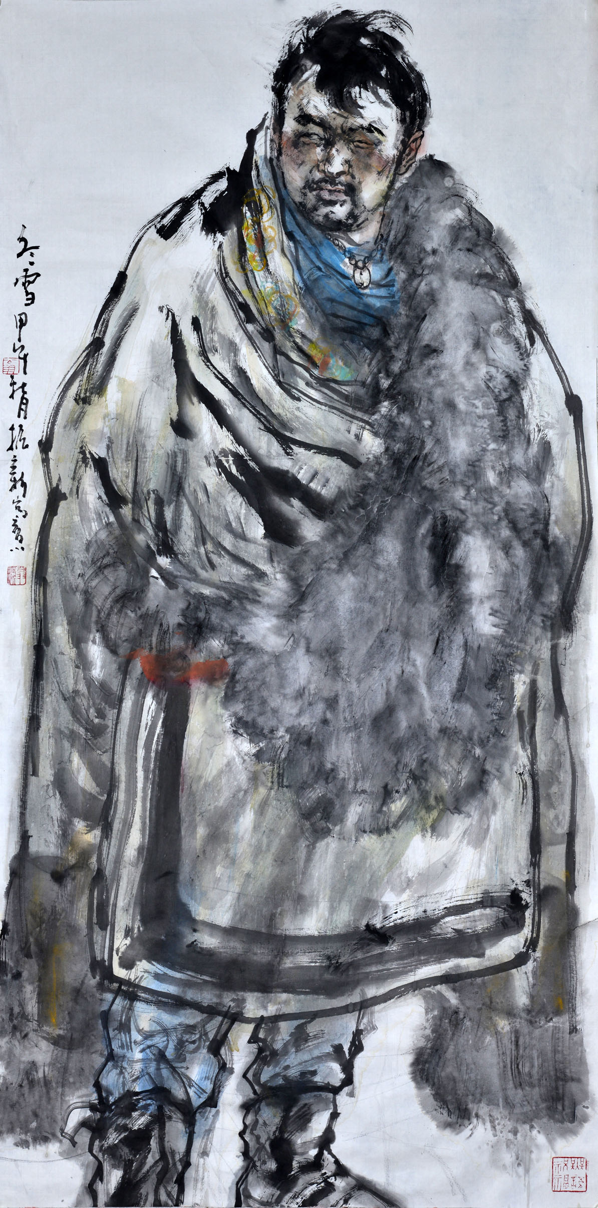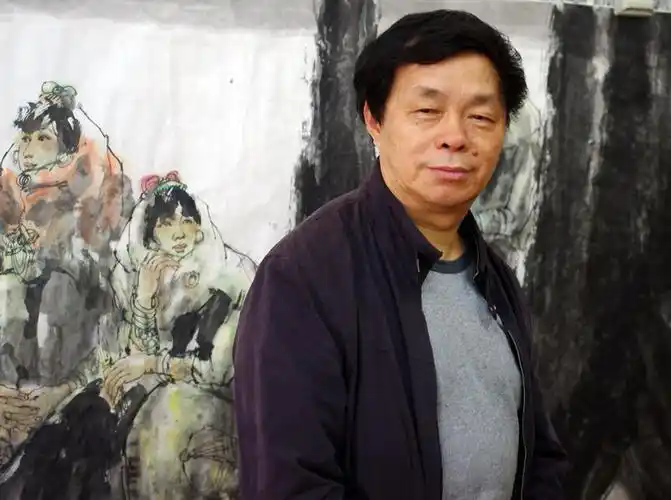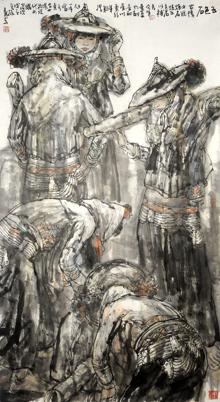 在他的作品中,強調(diào)大的紀念碑式的團塊結(jié)構(gòu),而有意識地過濾了具體的情節(jié)描寫,強調(diào)賦予生活化的形象以真實的人性,表現(xiàn)為作品有一種經(jīng)過推敲、琢磨的嚴肅感,理性的因素支持著感性的表現(xiàn),與筆墨渾然交織成豐富的形象內(nèi)涵。這種嚴肅和復(fù)雜意緒,拓展了水墨人物畫的表現(xiàn)力,為水墨藝術(shù)留下了一份時代的備忘錄。