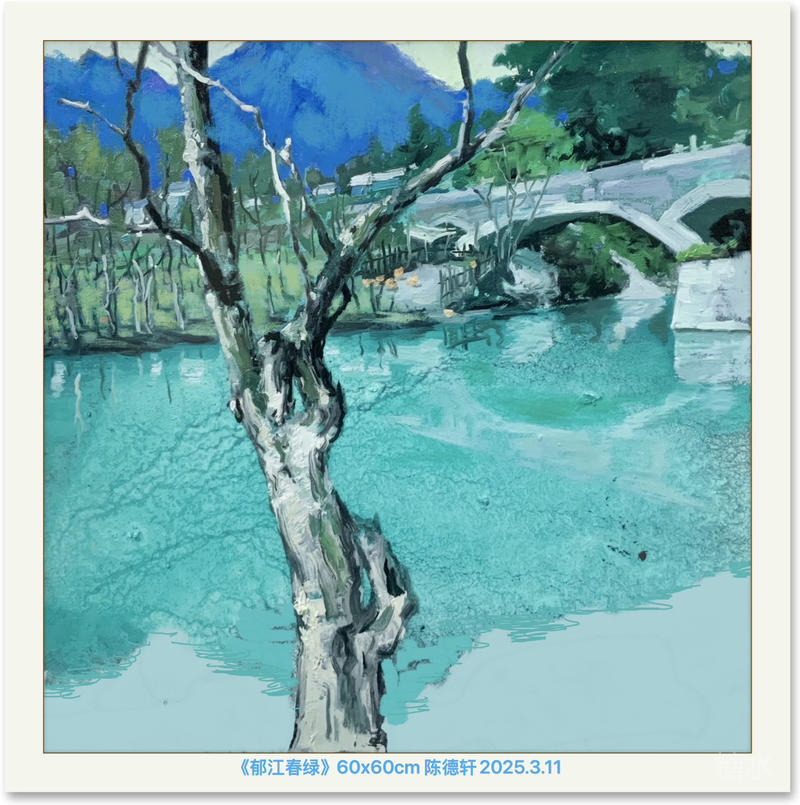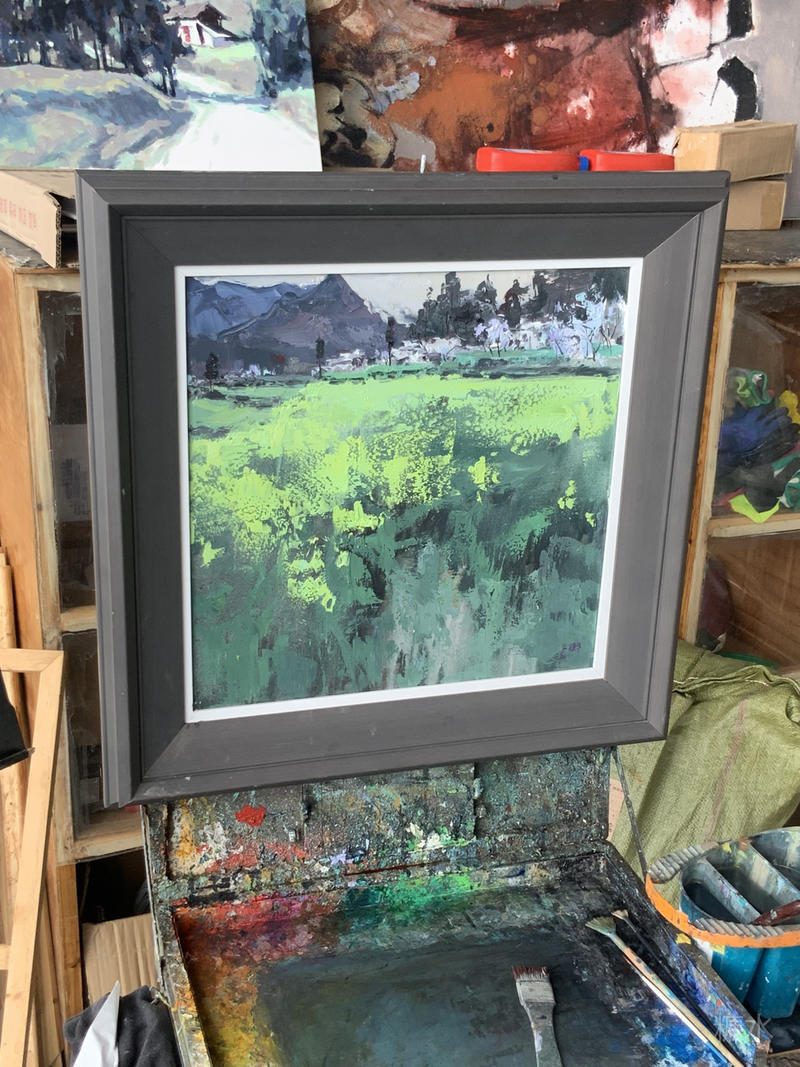 每年,我總會以油菜花為題,用各種不同的黃色在畫布上譜寫一場春天的絮語。可今年,那些明黃像吃多了的糖霜,膩在喉頭,于是我把“我的調(diào)色盤砸了個稀碎”我用略帶灰色的粉綠替代蜂蜜黃,讓更沉的墨綠壓住春天的躁動。