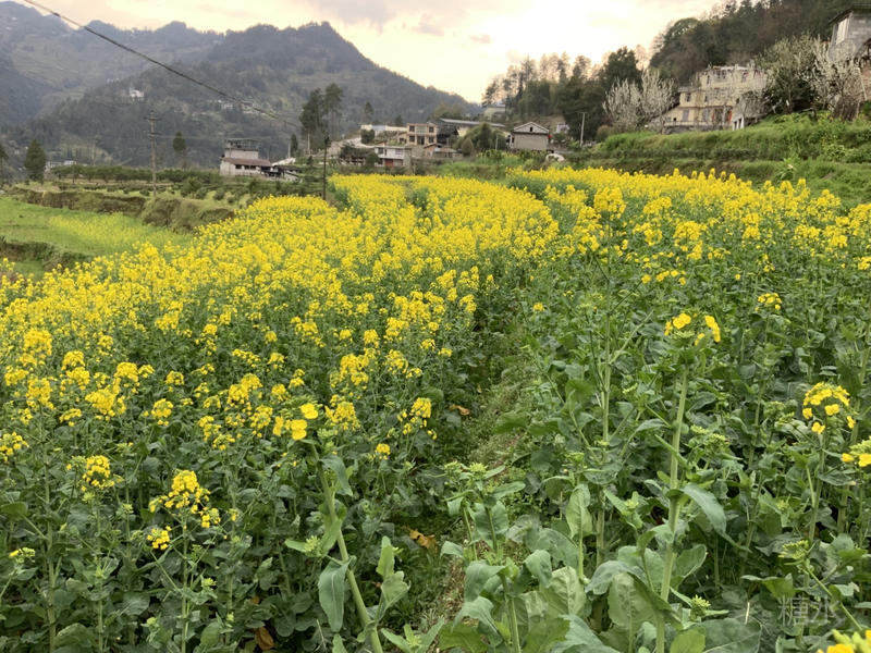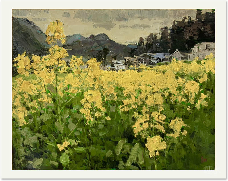 當(dāng)?shù)朵h劈開墨綠底色時,粉綠像霧氣從山坳里漫出來,不是往年油菜花的甜膩,倒像一盅冷泡的綠茶,澀中帶清,在畫布上滲出薄霧般的涼意。刀痕遠山人家的沉默,粉綠是春寒里未醒的夢,三者絞纏成一首未譜完的曲子——調(diào)子淡了,可味覺卻更濃了。