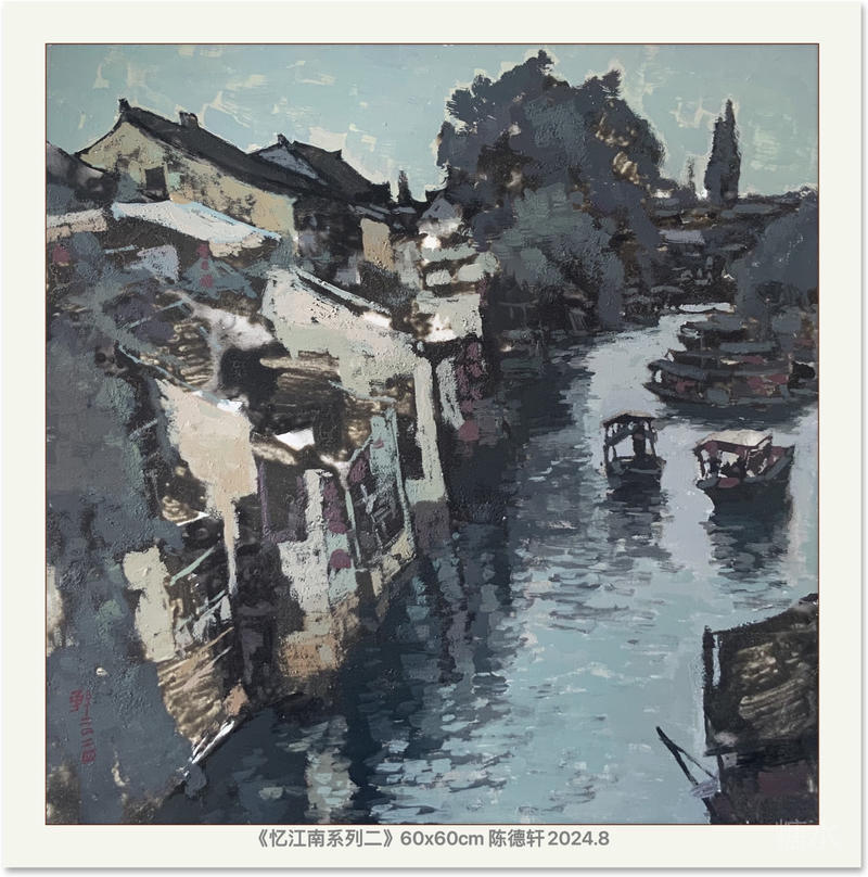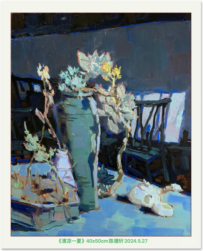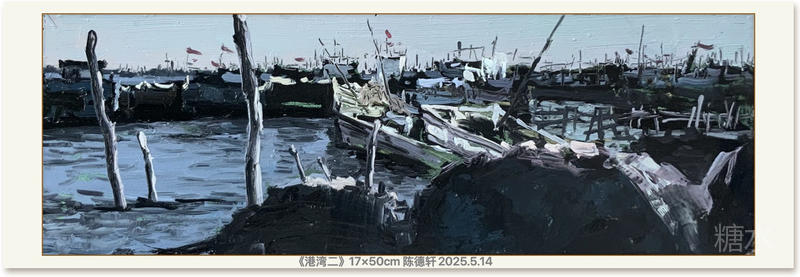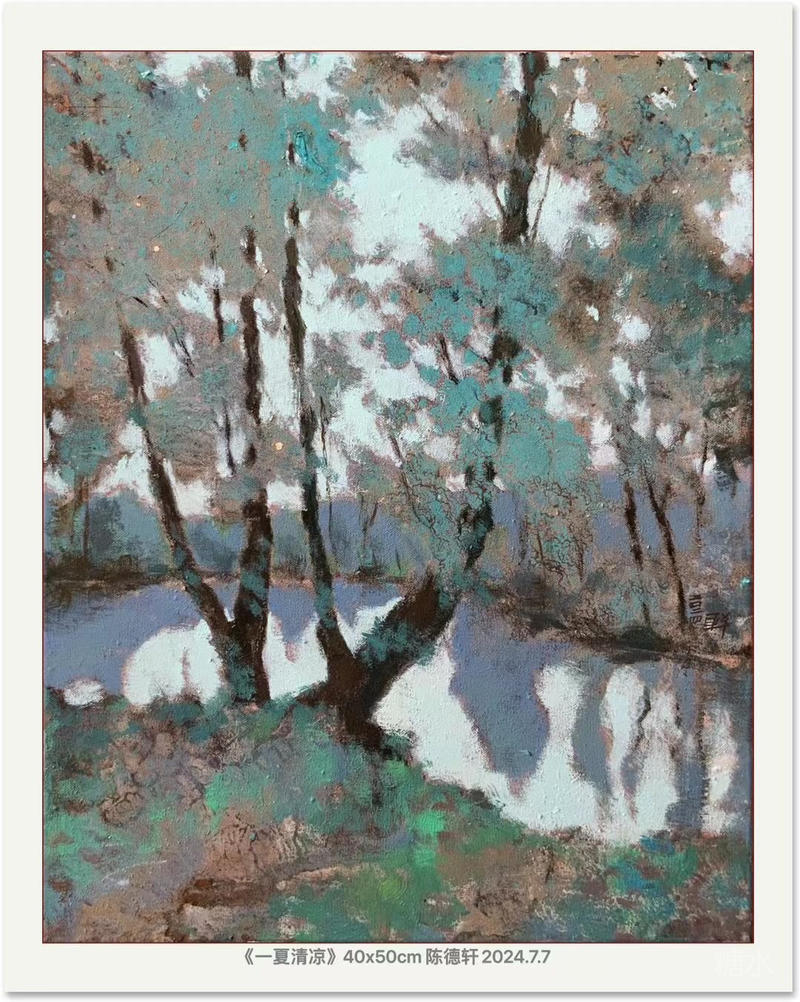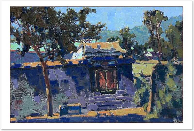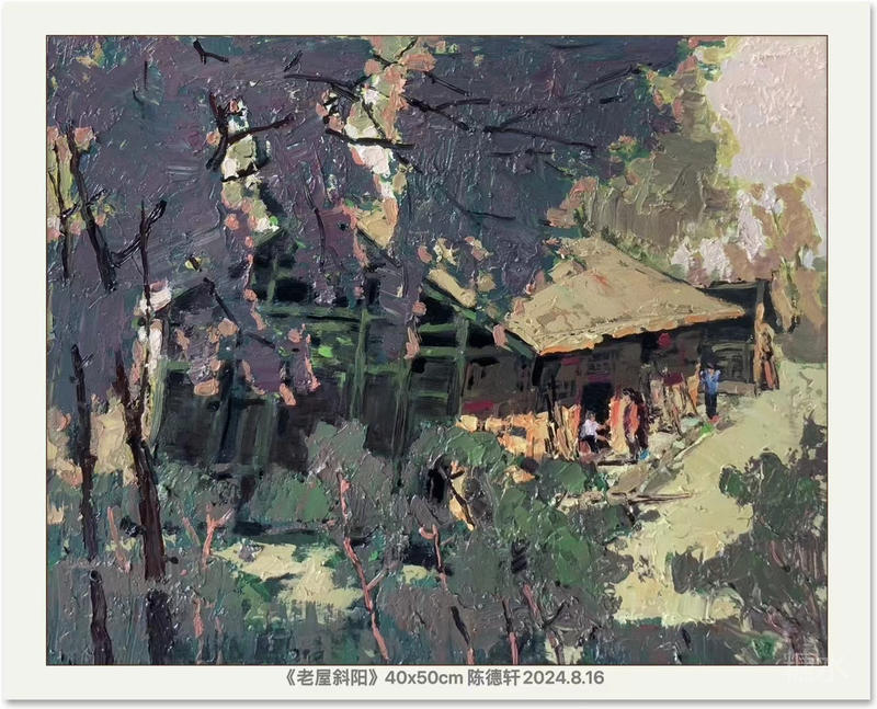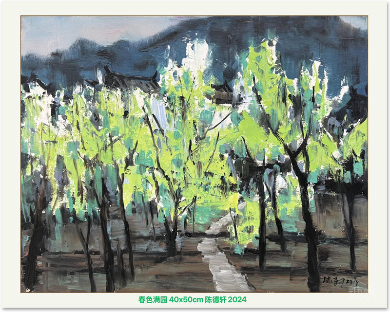 這幅作品畫的是農(nóng)家門前梨花開的場景。我刻意隱去了農(nóng)舍的風(fēng)霜刻痕,把春風(fēng)的溫柔揉進畫布里——梨花用粉綠、粉紫補色關(guān)系弱對比的方式層層堆疊,我努力把整個春天的清冽都凝結(jié)在畫里,力求讓每一簇空氣都透著骨子里的干凈。