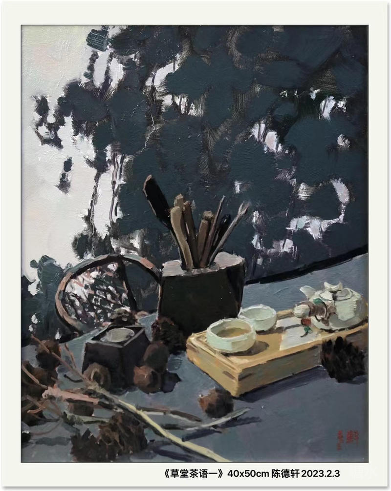 畫中茶席如一首未完成的“靜心謠”。冷灰桌面傾斜如未封的簡牘,松果枝在畫布上似乎想畫出跨越時空的甲骨文,松林在風(fēng)中低語,將沉悶的空氣撕開一道呼吸的裂隙。暖黃茶具臥于裂隙一隅,像一簇未燃的燭火,茶湯在杯中泛起琥珀光。那些傾斜的松果、搖曳的松影,原是天地為品茗者布下的棋局——冷灰中生出的暖意,恰是君子在落寞里靜待花開的禪機。正如孔明所言:'靜以修身,非淡泊無以明志',原來修身之道,早藏于茶湯與松影的裂隙之間。
