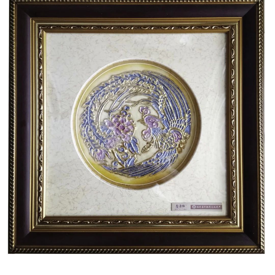詔安是中國書畫藝術之鄉(xiāng),美學思想源遠流長,漆線雕工藝的線條美、色彩美和圖案美與國學美學高度契合。其線條精細流暢,如書法筆觸,體現(xiàn)對線條韻律和節(jié)奏的追求。書法講究筆畫變化,漆線雕線條同樣富有藝術表現(xiàn)力,這得益于藝人高超技藝。