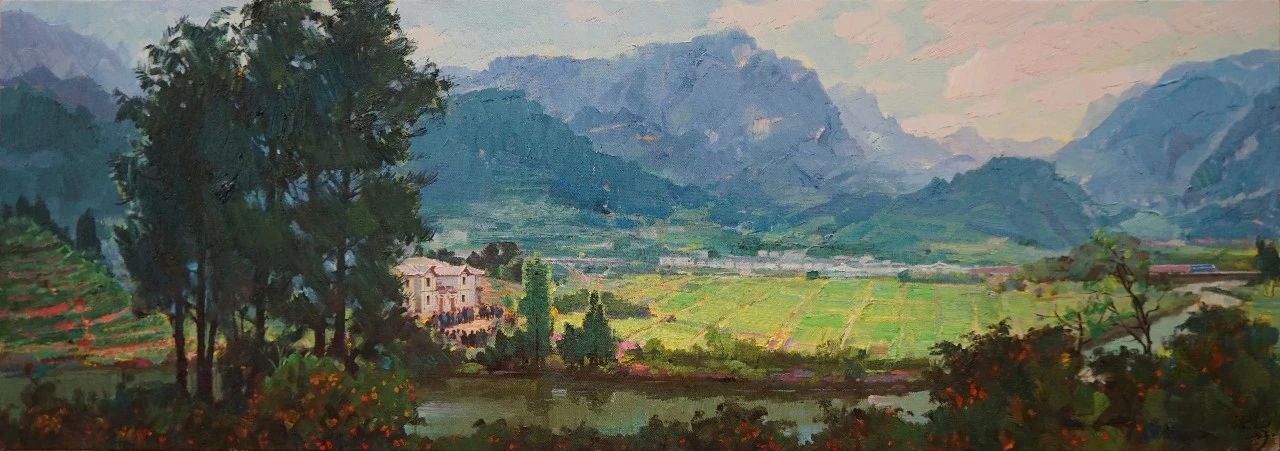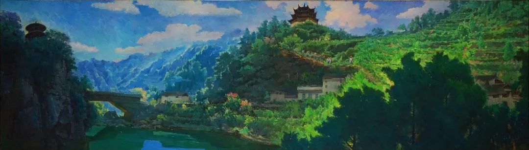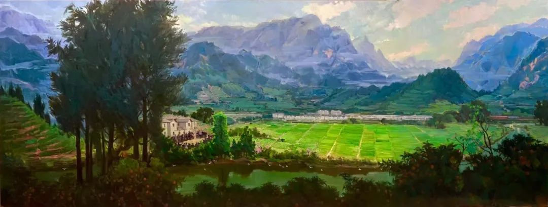 答:畫中我以“屏山帶水” 結(jié)構(gòu)串聯(lián)鄉(xiāng)村振興主題:近景的橙樹與左側(cè)層層疊疊茶山象征習(xí)總書記當(dāng)年提出大力發(fā)展的閩東特色的農(nóng)作物;純凈碧綠的霍童溪如飄帶一樣橫臥畫幅,白鷺群飛寓意著人與自然的和諧生態(tài)。枝繁葉茂的深色針葉松襯托著畬民新居,象征生命長(zhǎng)青;中景有兩個(gè)時(shí)空,它們通過一座橫跨的大橋連接兩個(gè)九仙村,一個(gè)是1989 年 “九仙新村” ,一個(gè)是今日“九仙花苑”。畫中白色畬民新居使得作品再現(xiàn)1989年習(xí)總書記一行人春節(jié)慰問畬鄉(xiāng)的場(chǎng)景,它是作品的畫眼;遠(yuǎn)景建筑群是九仙畬鄉(xiāng)新村---“九仙花苑”和火車站,右邊徐徐而行的火車是開往歐洲的中歐班列。最遠(yuǎn)處之提山云氣環(huán)繞宛如仙境,也體現(xiàn)出“九仙”這個(gè)地方獨(dú)特地貌。作品核心是通過藝術(shù)再現(xiàn),展現(xiàn)習(xí)近平總書記在福建寧德工作期間“四下基層”體察百姓疾苦、千方百計(jì)為群眾排憂解難的感人故事,傳遞“牢記囑托、感恩奮進(jìn)” 的鄉(xiāng)村振興精神。