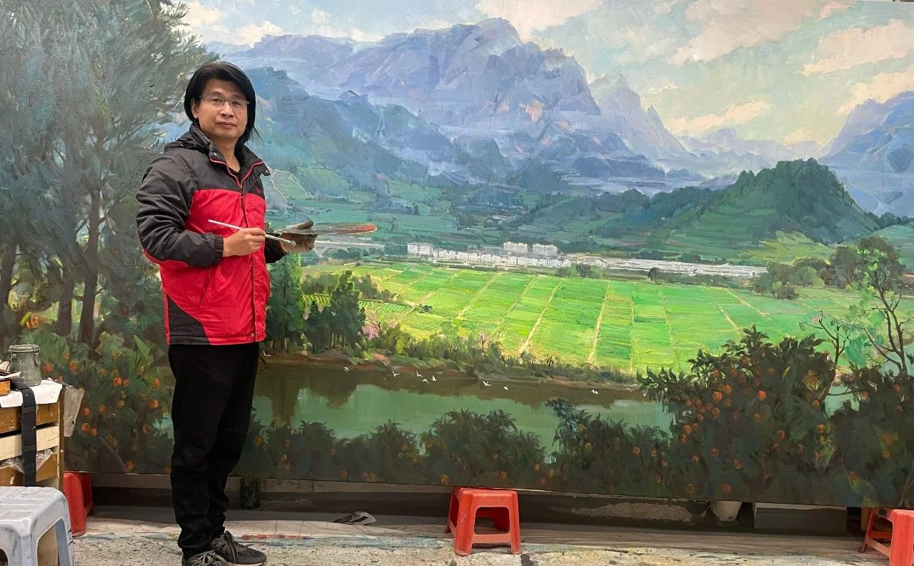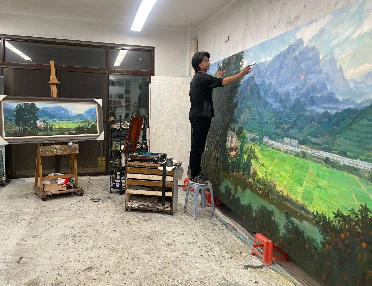 答:《九仙之春》是我2023 年受寧德市蕉城區(qū)委托,為九仙鄉(xiāng)村振興主題館創(chuàng)作的大型主題油畫。這幅作品與 2021 年創(chuàng)作的《難忘下黨》(840×260cm)構(gòu)成系列,后者收藏于寧德難忘下黨學(xué)習(xí)基地,表現(xiàn)的是習(xí)近平總書記“三進(jìn)下黨” 引領(lǐng)當(dāng)?shù)孛撠毐夹】档臍v程,以及從幸福之路邁向美好之路的美好愿景。而《九仙之春》則聚焦總書記“四下基層” 對(duì)閩東畬鄉(xiāng)的關(guān)懷,展現(xiàn)九仙村從災(zāi)后重建到鄉(xiāng)村振興的蛻變,是對(duì)習(xí)總書記心系基層百姓的藝術(shù)呼應(yīng)。