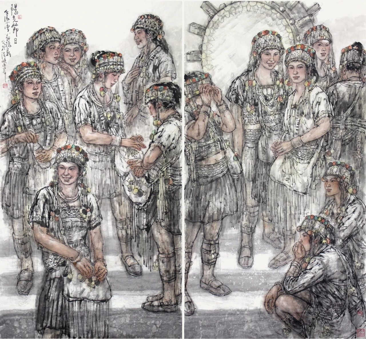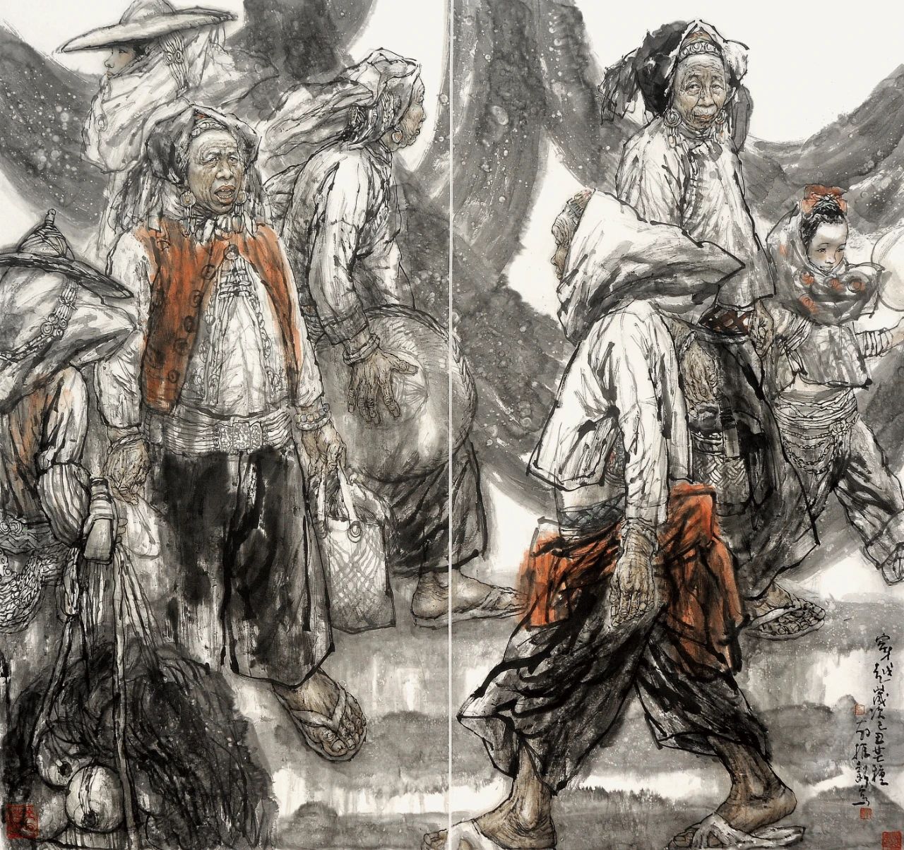 翁:其一,“意”是寫(xiě)意人物畫(huà)的內(nèi)在特質(zhì),也是寫(xiě)意人物畫(huà)的核心。寫(xiě)意人物畫(huà)重在傳神寫(xiě)意,有強(qiáng)烈的抒情性,它不拘泥于諸如比例、透視、結(jié)構(gòu)、解剖、光影、色彩、質(zhì)地、肌理等的如實(shí)描摹,而是特別重視主客觀統(tǒng)一的意象表現(xiàn),即以形寫(xiě)神,情景交融,調(diào)動(dòng)包括夸張、變形、取舍、隱喻等各種藝術(shù)手段去強(qiáng)化對(duì)象的內(nèi)在本質(zhì)。寫(xiě)意人物畫(huà)也有強(qiáng)烈的創(chuàng)造性。就畫(huà)面經(jīng)營(yíng)來(lái)說(shuō),是平面空間意識(shí),不受焦點(diǎn)透視和客觀景物的限制,為了表現(xiàn)畫(huà)家的思想意圖、審美情趣,甚至可以根據(jù)畫(huà)面需要,突破時(shí)間空間的制約而進(jìn)入更為自由的境界。如把不同時(shí)間的人物、景物有機(jī)地組織在一幅畫(huà)面中,或在一幅畫(huà)中展現(xiàn)情節(jié)的持續(xù)發(fā)展,不受科學(xué)透視的約束,自由而能動(dòng)地表現(xiàn)對(duì)象的形體和空間,而詩(shī)、書(shū)、畫(huà)、印之熔為一爐,又使畫(huà)面產(chǎn)生特殊的效果,給人們留下咀嚼、體味的余地。