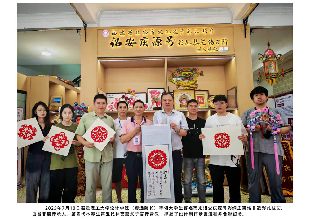 2025年7月10日福建理工大學(xué)設(shè)計(jì)學(xué)院(繆遠(yuǎn)院長(zhǎng))率領(lǐng)大學(xué)生暮名而來詔安慶源號(hào)彩綢莊研培非遺彩扎技藝,由省非遺傳承人,第四代林養(yǎng)生第五代林藝聰父子言傳身教,撐握了設(shè)計(jì)制作步聚流程并合影留念。