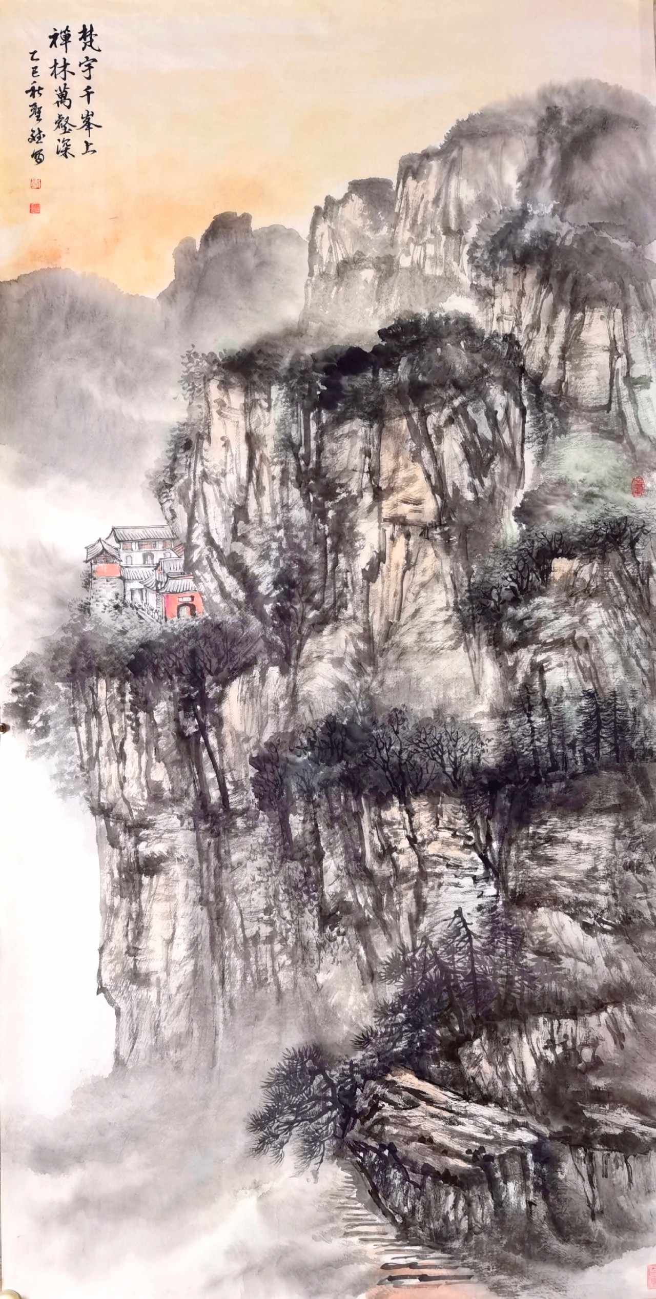 太行的峰巒正應和著今日的腳步。掛壁公路如“銀線”纏山,是當代人對“天險”的應答——峰巒半腰,以淡墨勾出公路曲線,與巖的蒼勁形成“剛柔相濟”,似“向山要路”的勇氣在回響;生態(tài)保護讓“荒山”復綠,是人與自然的和解——近山處用“小青綠”染林,遠峰卻留些許赭石,讓“新綠”與“舊巖”對話,似“綠水青山”的理念在蔓延。峰巒是“景”,當下是“情”,畫中不必刻意說教,卻讓觀者從巖的“恒”與景的“變”里,聽見“時代向前,山水共情”的當代回響。