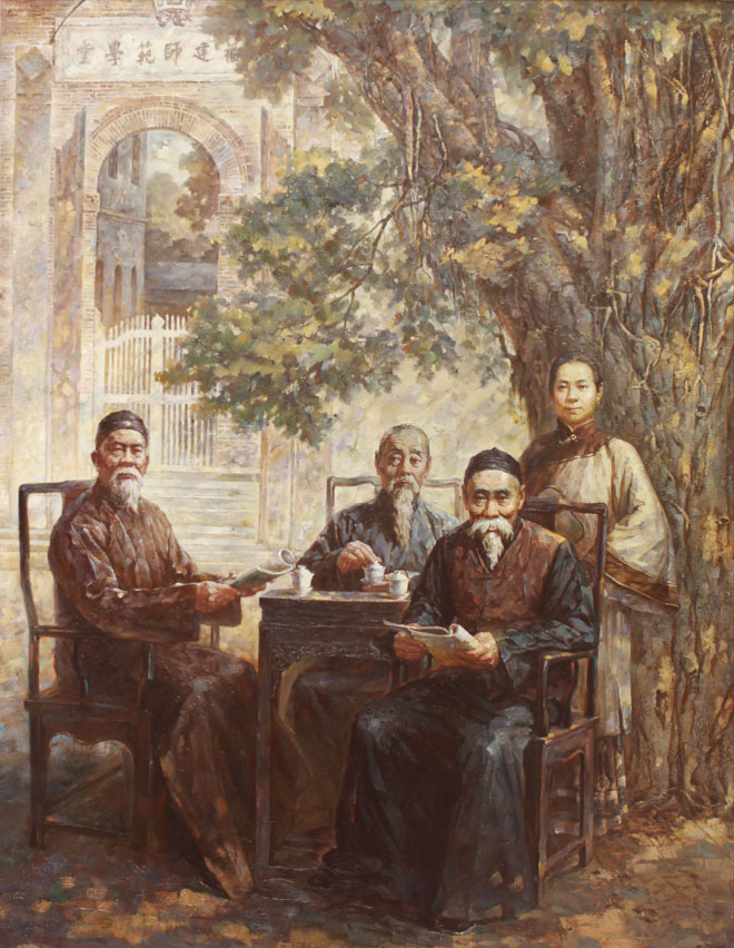 答:我自幼便對(duì)歷史有著濃厚的興趣,懷揣著這份情感,自2010年起開始創(chuàng)作大型歷史畫《閩水萬(wàn)古流》,至今已創(chuàng)作了十幾張歷史題材的美術(shù)作品?;蛟S有人會(huì)認(rèn)為主題創(chuàng)作頗具政治性傾向,但其實(shí)這種觀點(diǎn)并不完全準(zhǔn)確。在我看來(lái),美術(shù)史上所有最為出色的優(yōu)秀作品幾乎都是主題性創(chuàng)作,尤其是那些與時(shí)代緊密相連的作品。我的主題創(chuàng)作由兩個(gè)方向構(gòu)成:一是具有時(shí)代特色的主題性人物和事件,諸如《人》《大地之殤》《時(shí)代楷模孫麗美》《難忘下黨》《生命的呼喚》《九仙之春》《正月里》《潤(rùn)物細(xì)無(wú)聲》《生生不息》《生火》等,這些作品與時(shí)代緊密相關(guān);另一個(gè)則是我所感興趣的、過(guò)去發(fā)生的歷史人物和事件,像《閩水萬(wàn)古流》《陳寶琛》《鄭成功收復(fù)臺(tái)灣》《綠色豐碑——人民好干部谷文昌》《譯壇先驅(qū)——嚴(yán)復(fù)、林紓、辜鴻銘》《破冰之旅——胡錦濤會(huì)見(jiàn)連戰(zhàn)》《中蒙邊境保衛(wèi)戰(zhàn)》《“向東”風(fēng)云》《萬(wàn)人空巷》《鄭振鐸和摯友們》等。