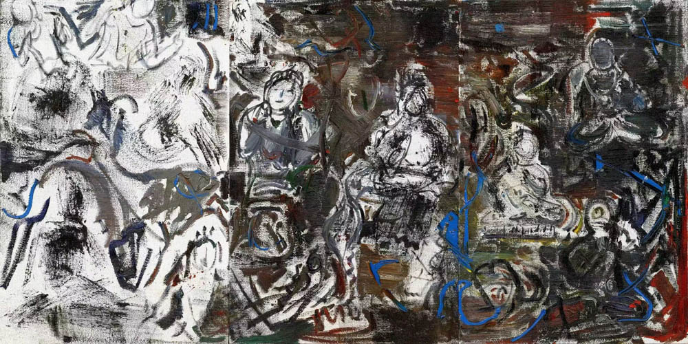 十余年前,他在炳靈寺石窟上下穿行,筆下的油彩裹挾著沉積的褐土,使千年的遺存在畫布上重現(xiàn),展開了與西秦、北魏和晉唐壁畫的跨越時(shí)空的對(duì)話。洞窟里被香火暈染的佛造像和巖壁上凝固千年的線條,都化作他素描本上躍動(dòng)的生命韻律。2025 年,他重入張掖馬蹄寺石窟群的金塔寺,徘徊于斑駁壁畫與莊嚴(yán)雕塑之間,用筆墨再次丈量了信仰和文明的深度。這兩次石窟寫生,恰似兩場(chǎng)精神的巡禮,賦予他筆下的畫作,不僅有遺址滄桑的存跡,更浸潤(rùn)著佛教文化獨(dú)有的寧?kù)o與肅穆。