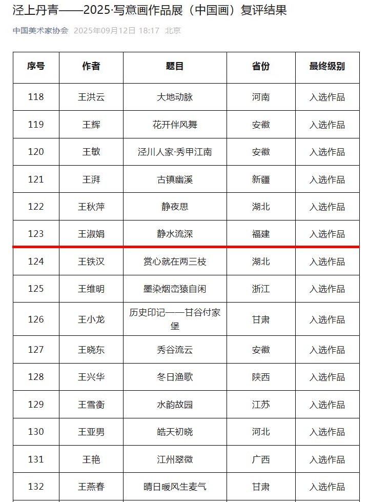 王淑娟作品《靜水流深》入選涇上丹青——2025·寫意畫作品展(中國畫)