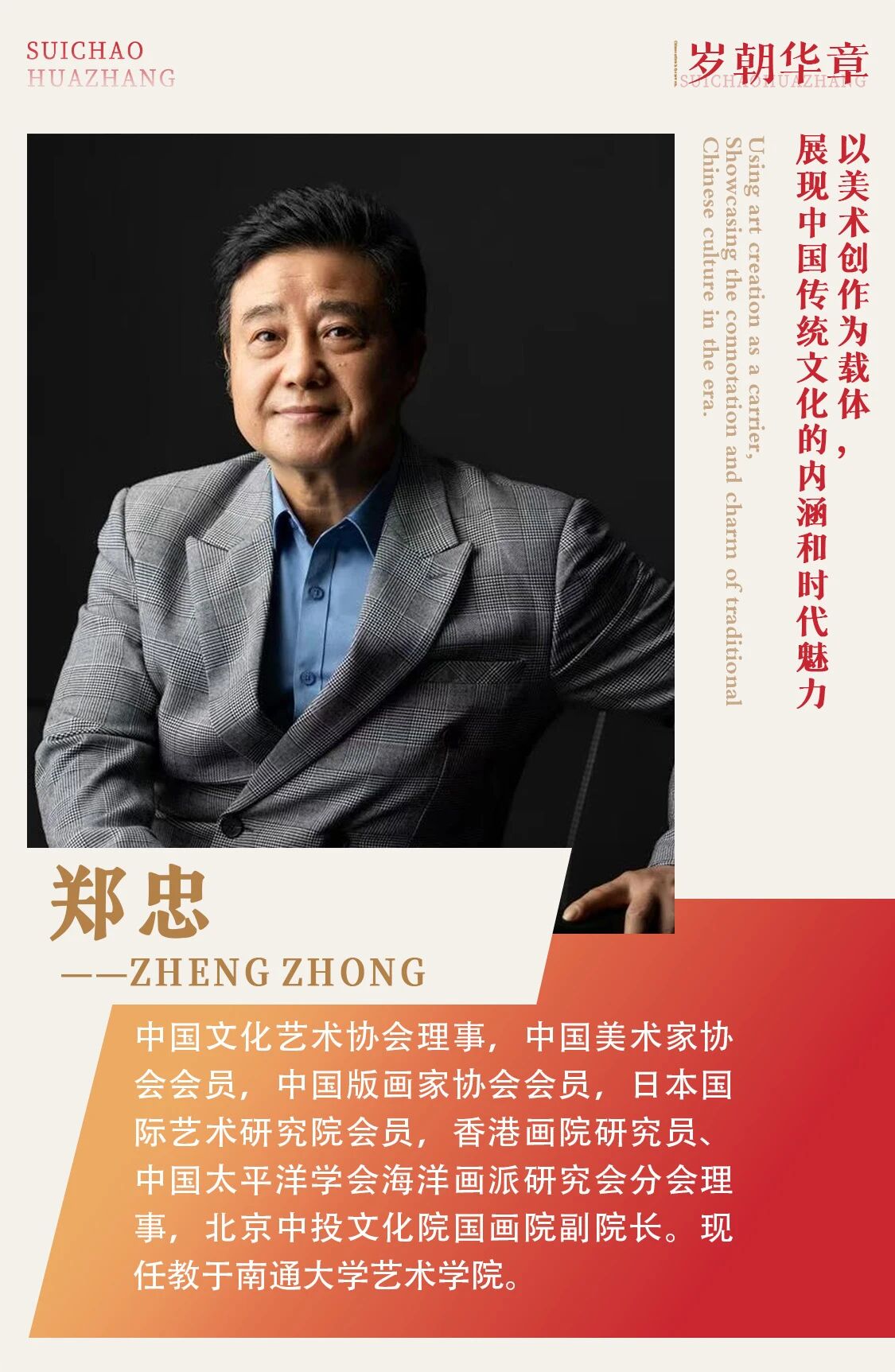 鄭忠,1962年生于江蘇海安,1979年~1985年為海軍南海艦隊(duì)潛水員,1988年畢業(yè)于南通大學(xué)美術(shù)學(xué)院,1999年畢業(yè)于中央美院版畫系研究生班,2000年至2004年任教于西安美術(shù)學(xué)院版畫系,1997年為中國(guó)藝術(shù)研究院《美術(shù)觀察》“美術(shù)名家”隆重推介。1998年北京文藝出版社出版吳冠中自傳《生命的風(fēng)景》遴選鄭忠作品做封面,2002年為南通市檔案局審定為南通歷史上第144位歷史文化名人?,F(xiàn)為中國(guó)文化藝術(shù)協(xié)會(huì)理事,中國(guó)美術(shù)家協(xié)會(huì)會(huì)員,中國(guó)版畫家協(xié)會(huì)會(huì)員,日本國(guó)際藝術(shù)研究院會(huì)員,香港畫院研究員、中國(guó)太平洋學(xué)會(huì)海洋畫派研究會(huì)分會(huì)理事,北京中投文化院國(guó)畫院副院長(zhǎng)。現(xiàn)任教于南通大學(xué)藝術(shù)學(xué)院。